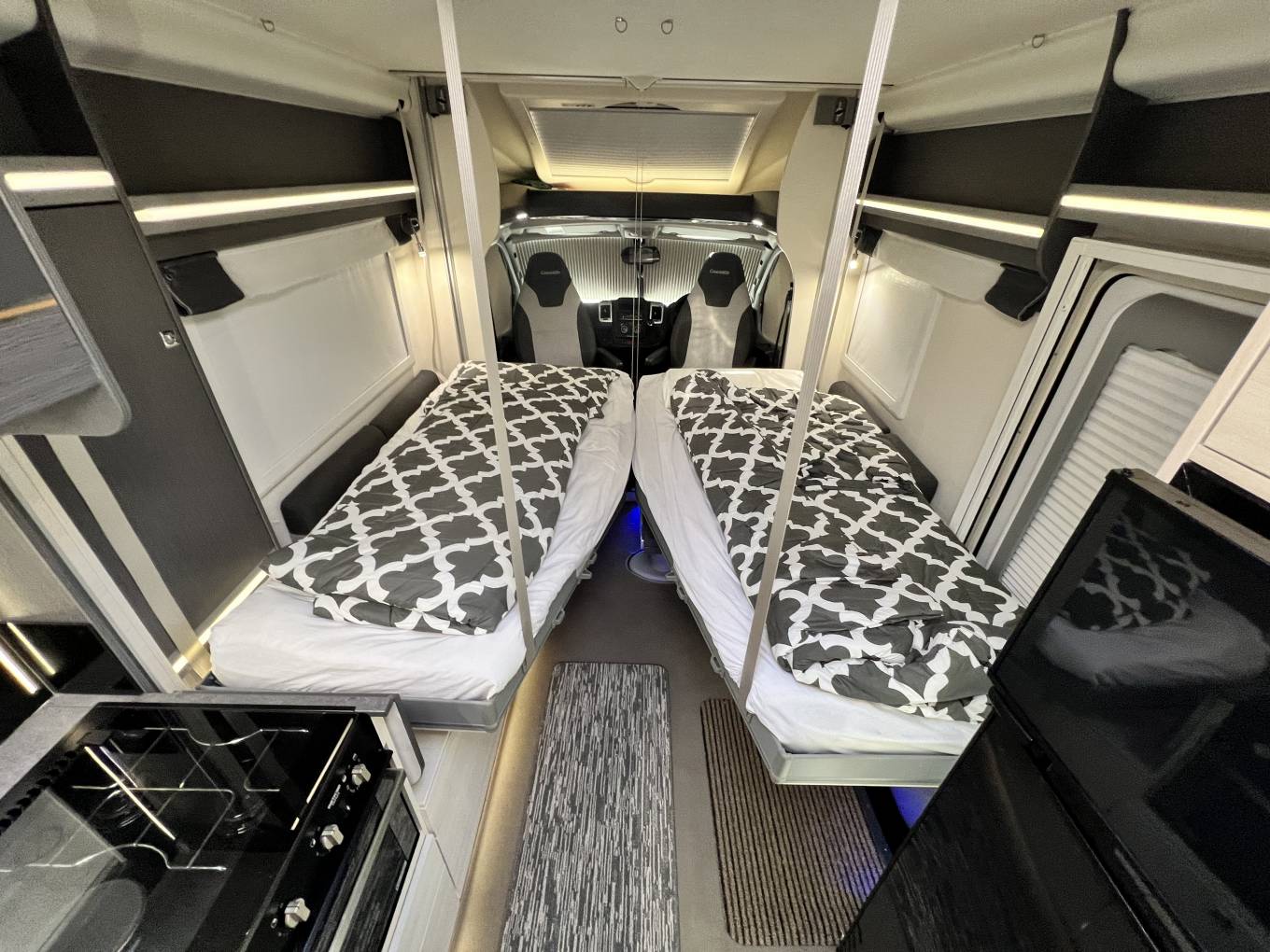 Press a button and down comes Two 6ft 2in x 3ft Single beds right down to seat level.