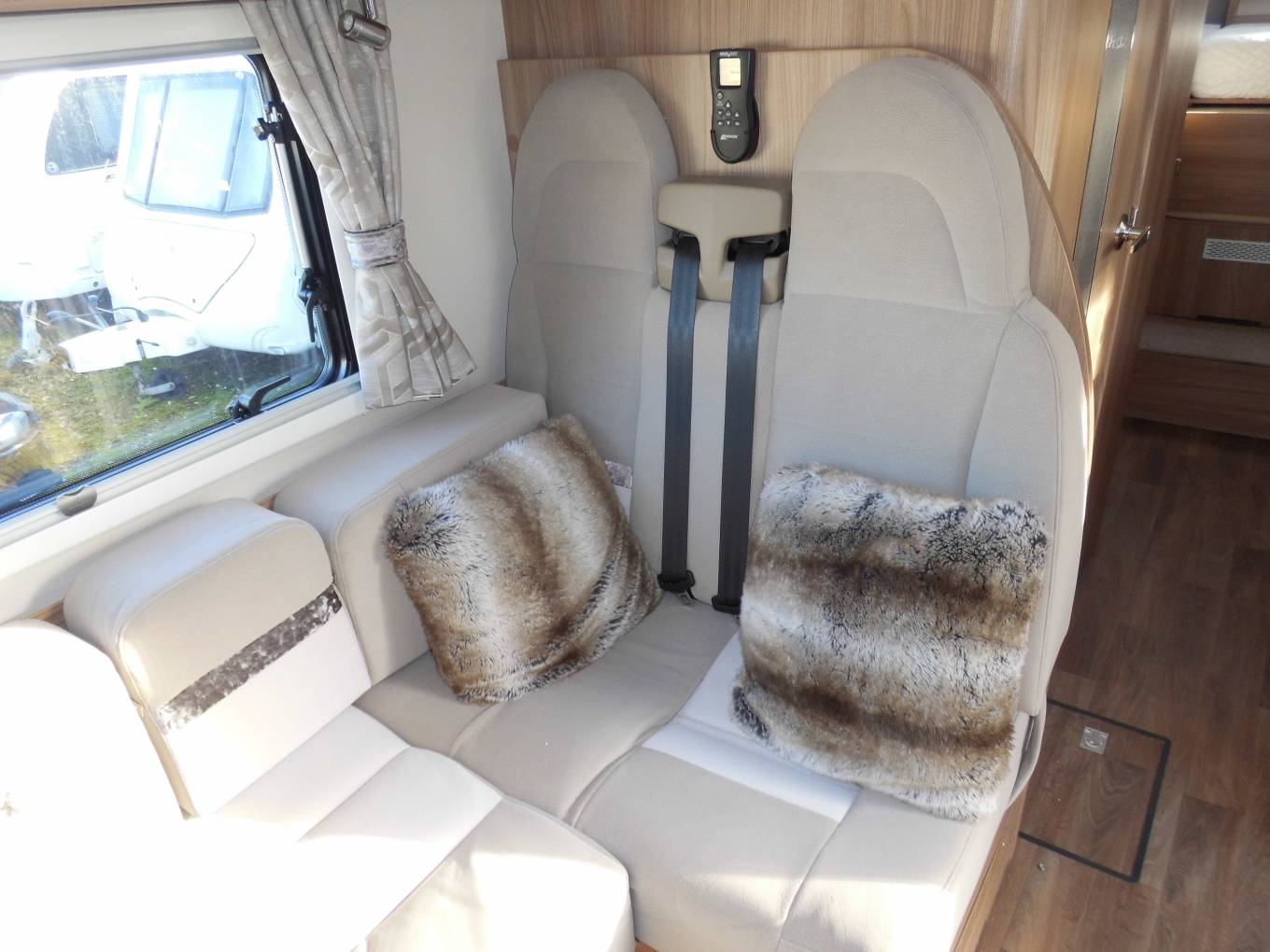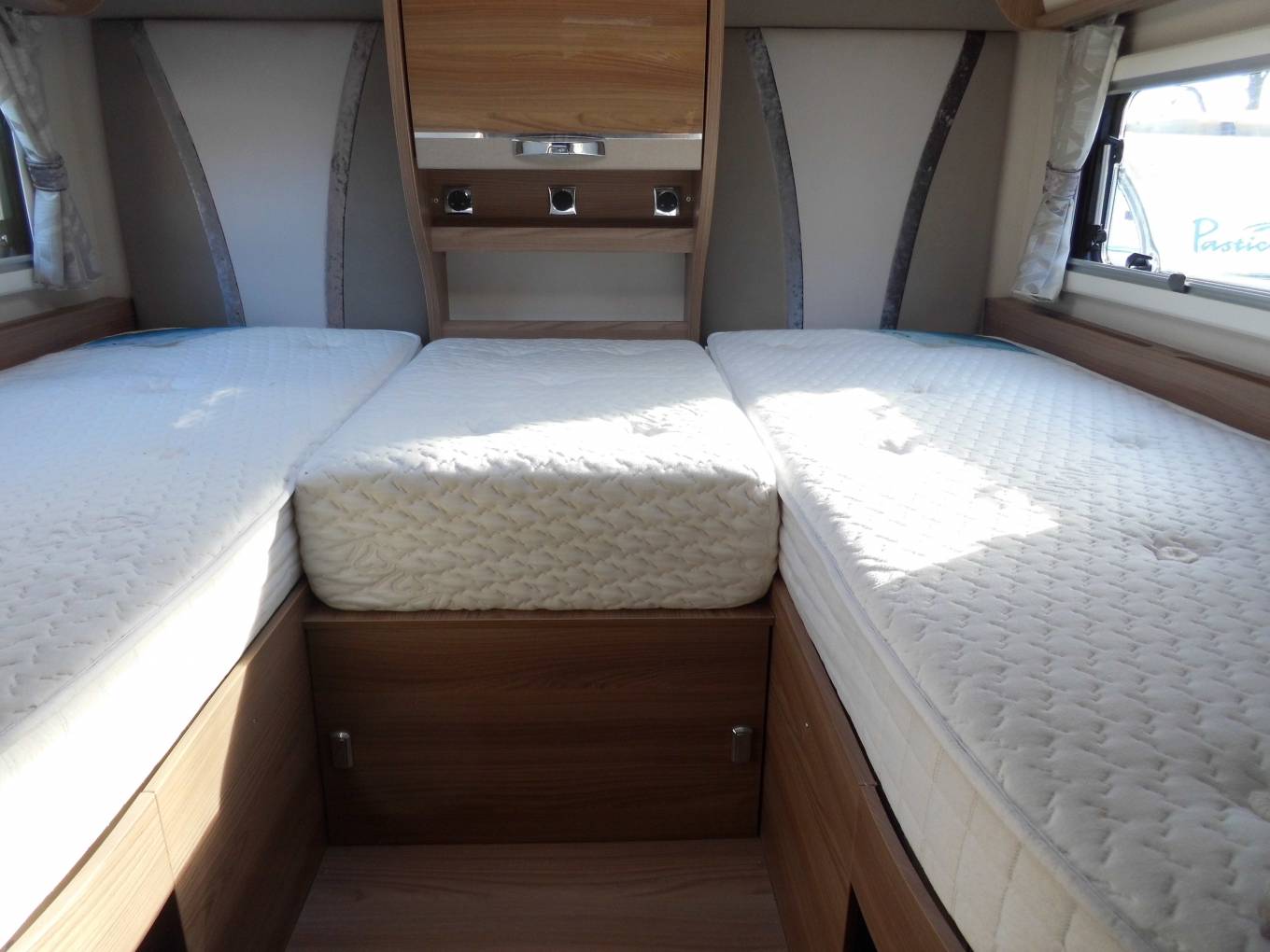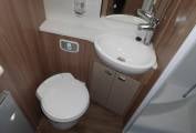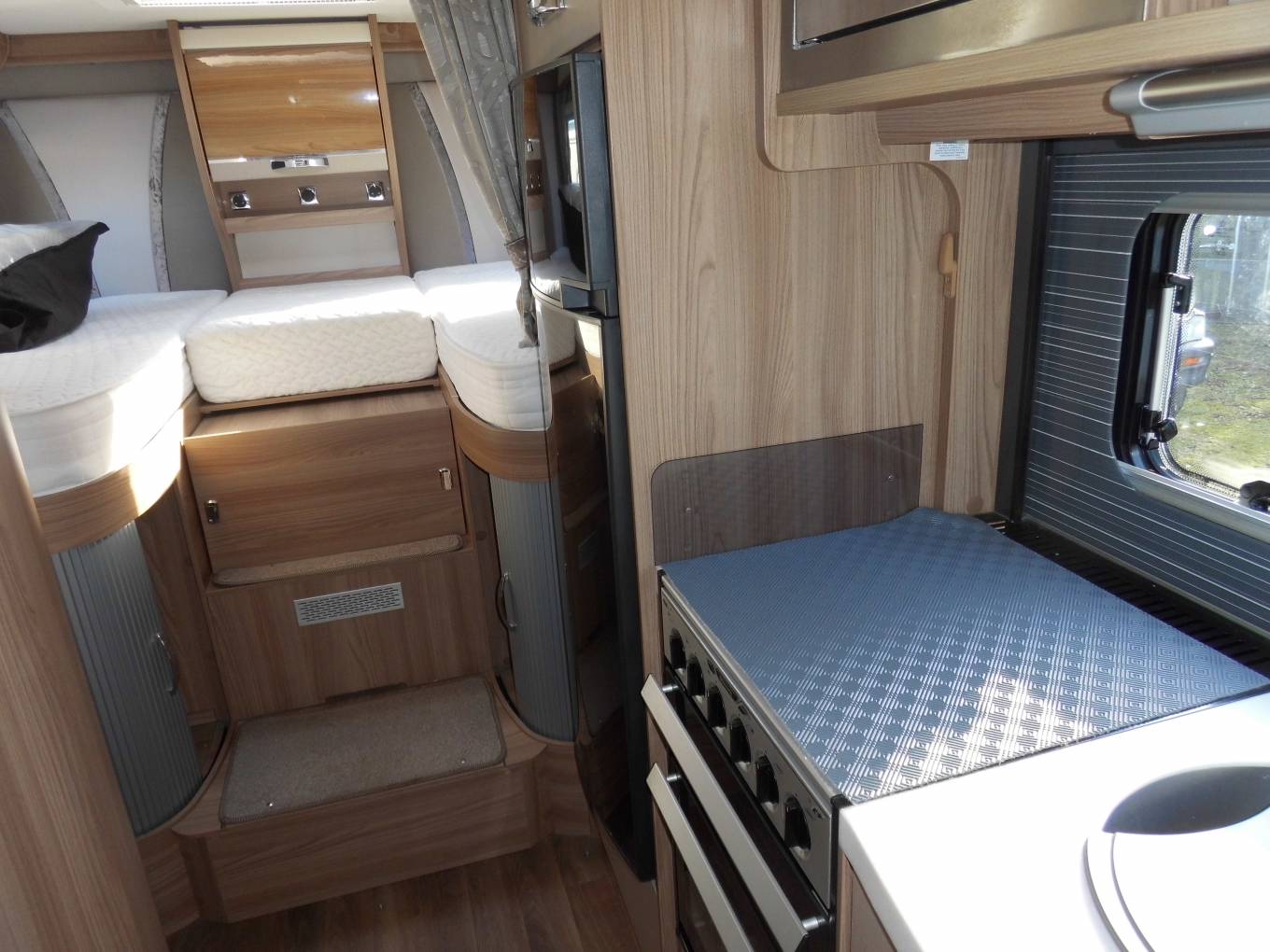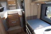 Generous 534kg payload capacity, .With its kitchen the 635 trounces much of the opposition. You get a Thetford cooker with dual-fuel hob plus separate oven and grill, as well as a fitted microwave directly above at a convenient height. The washroom has a swivel-bowl toilet, fixed basin and step-in, fully lined shower cubicle with moulded step area, There’s a second wardrobe and shelved storage at the foot of each bed. That still leaves plenty of space in the garage area below.
