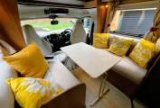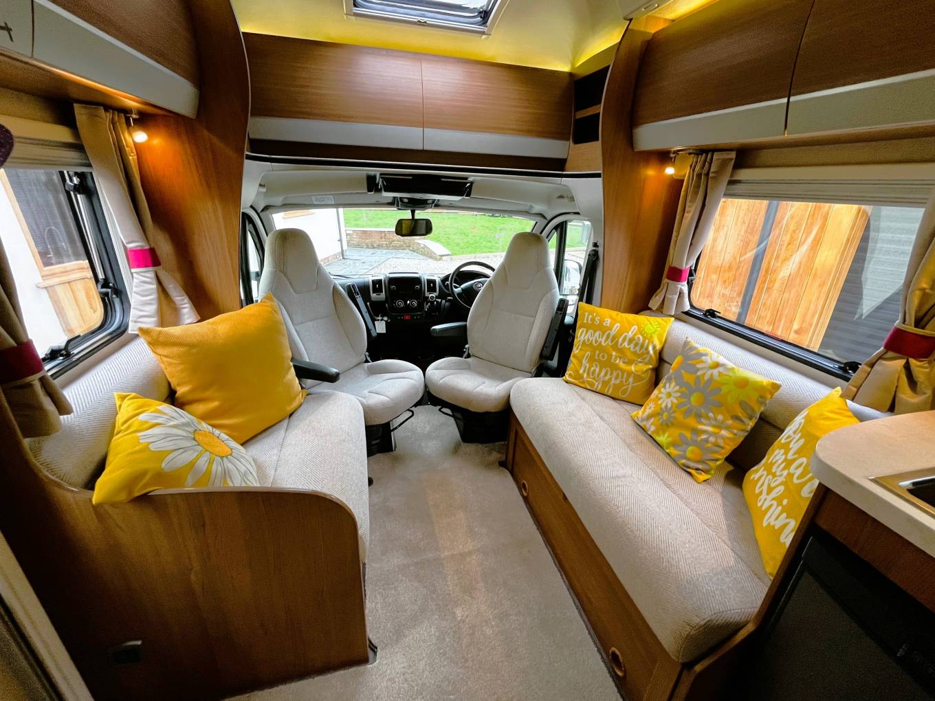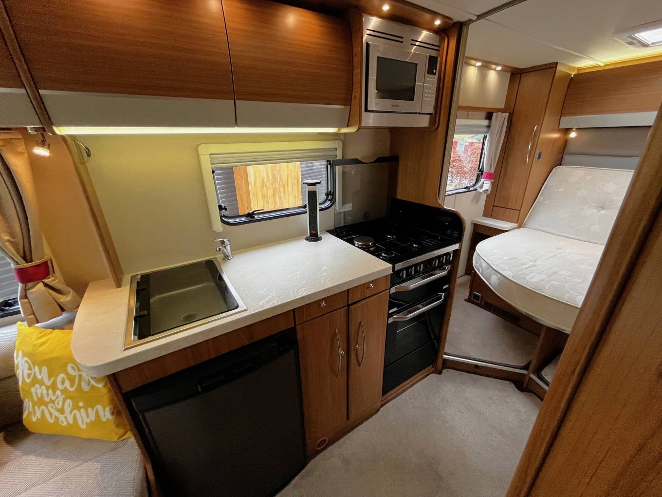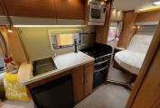 An electrically operated step takes you through the central door into the main habitation area. The lounge to your left is a sociable space with a pleasing atmosphere, thanks to daylight that enters from both side windows and the large cab skylight. The lounge seating is comfortable, and a folding table can be added for dining, entertaining or even doing a bit of work. With the driver and passenger captains seats turned into the lounge area you not only have an armchair style seating option, but space too, to comfortably seat 5 adults. Lift and pull out the seat bases of the side sofas and the area turns into a small double bed allowing the overnight accommodation for visiting guests. A drop down Avtex TV is conveniently mounted in the ceiling for relaxed viewing from the lounge area. Overhead lockers provide plenty of storage space.