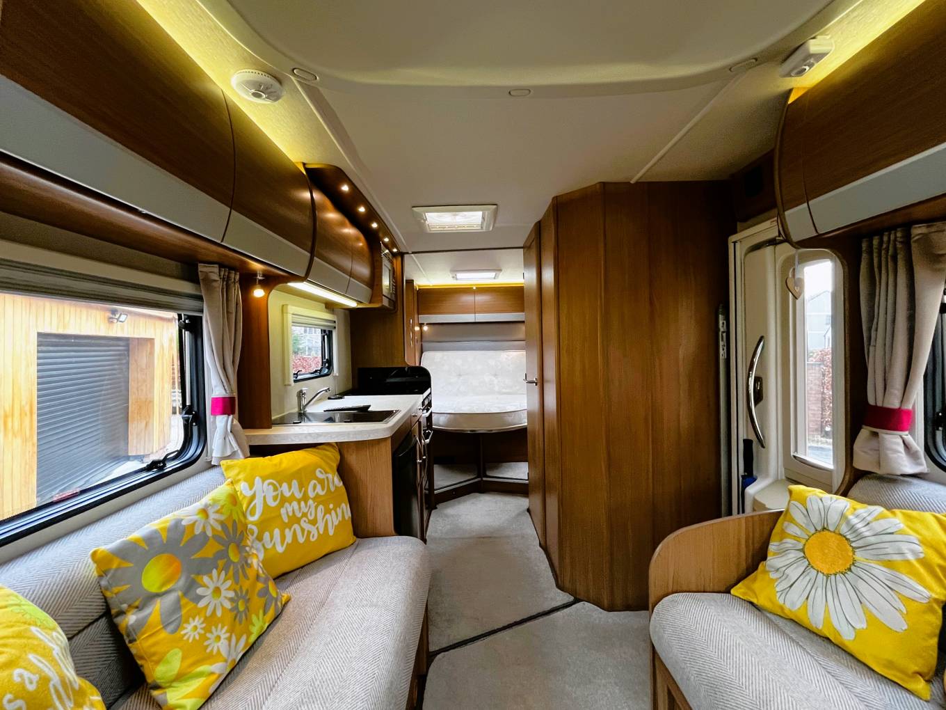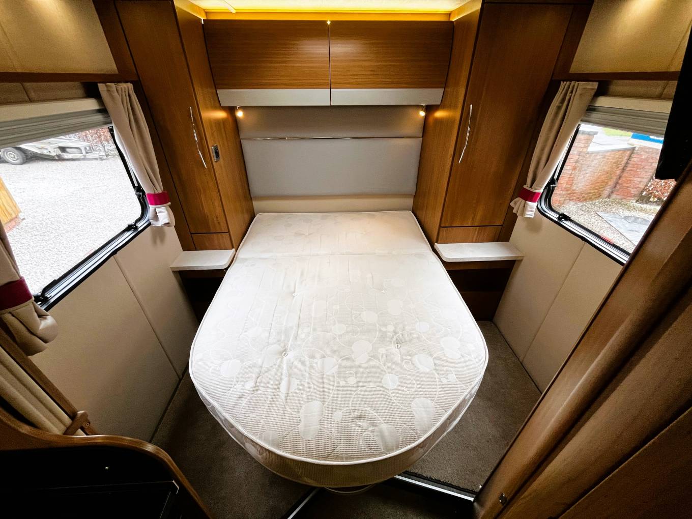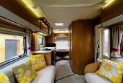 The kitchen comes with all any cook needs to whip up anything from beans on toast to a full Sunday roast! Full oven, grill and duel-fuel hob (3x gas burners and 1x electric hotplate), microwave oven and a good sized sink with overtop cooker and sink lids providing additional preparation space on top of the generous counter top space. The undercounter fridge with freezer box offers 96L of space and has 3 way power to operate on both 12V and 230V electric and gas - ideal for day trips or wild camping when you haven't got the electric hook up option. A storage cupboard and two built in drawers sit beneath the counter to the side of the fridge with overhead lockers above. A pull up 230V multi socket providing all the power connection you might need for a kettle, toaster etc.