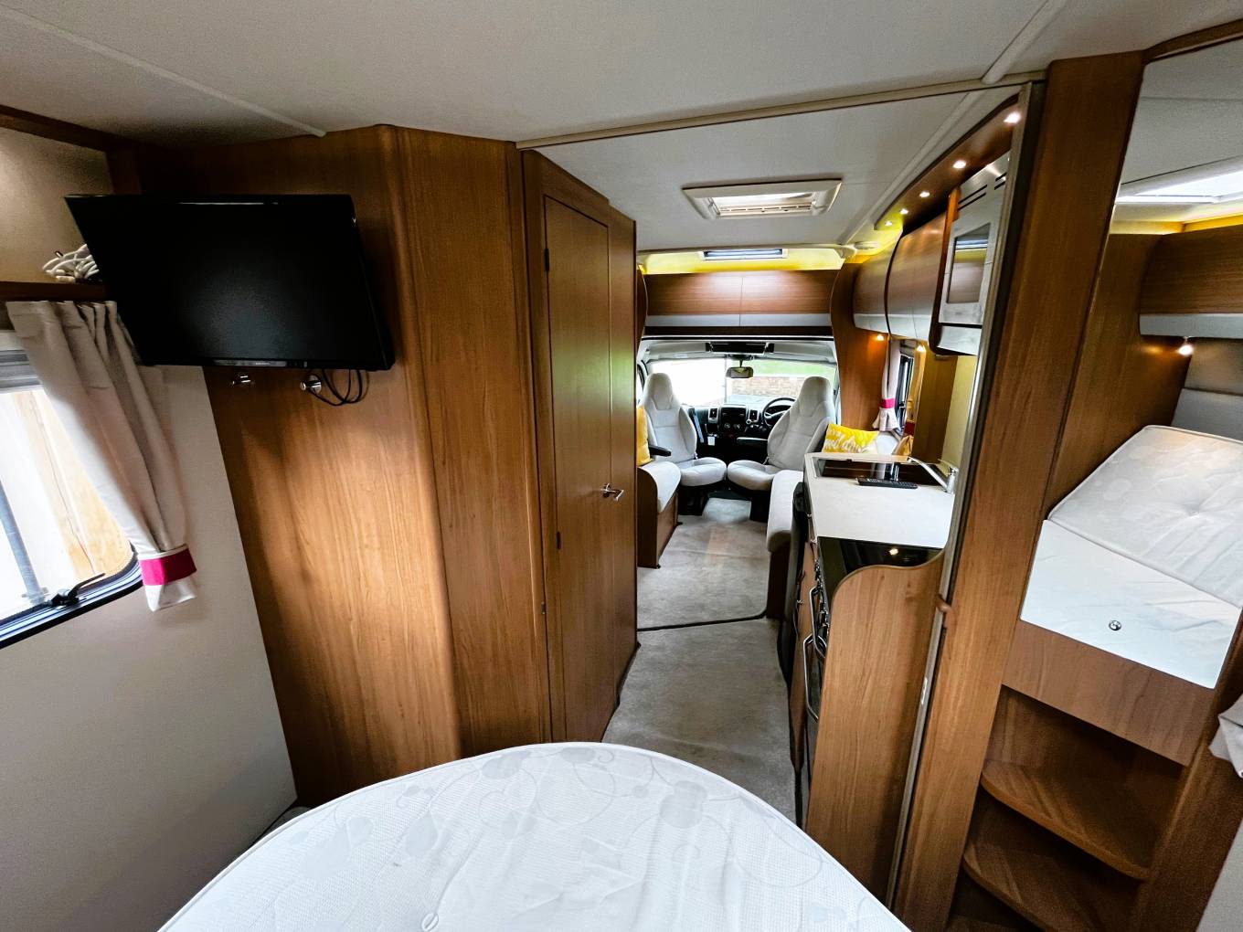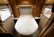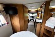 To the rear is the fabulous island bed. Can be positioned as a day bed to provide comfortable lounging when reading or relaxing or slides out to a full 6'1" x 4'4" double. Plenty of storage from the two side wardrobes and overhead lockers. A TV is also mounted in the bedroom area and provides an additional viewing option. A sliding partition separates the master bedroom from the rest of the living accommodation to create a cosy and private space.