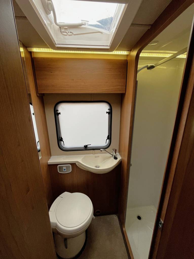 Opposite the kitchen, a privacy door opens up into the washroom with home from home comforts. An electric flushing cassette toilet, wash basin and fully enclosed separate shower cubicle along with a vanity mirror and all set in a very usable space.