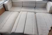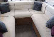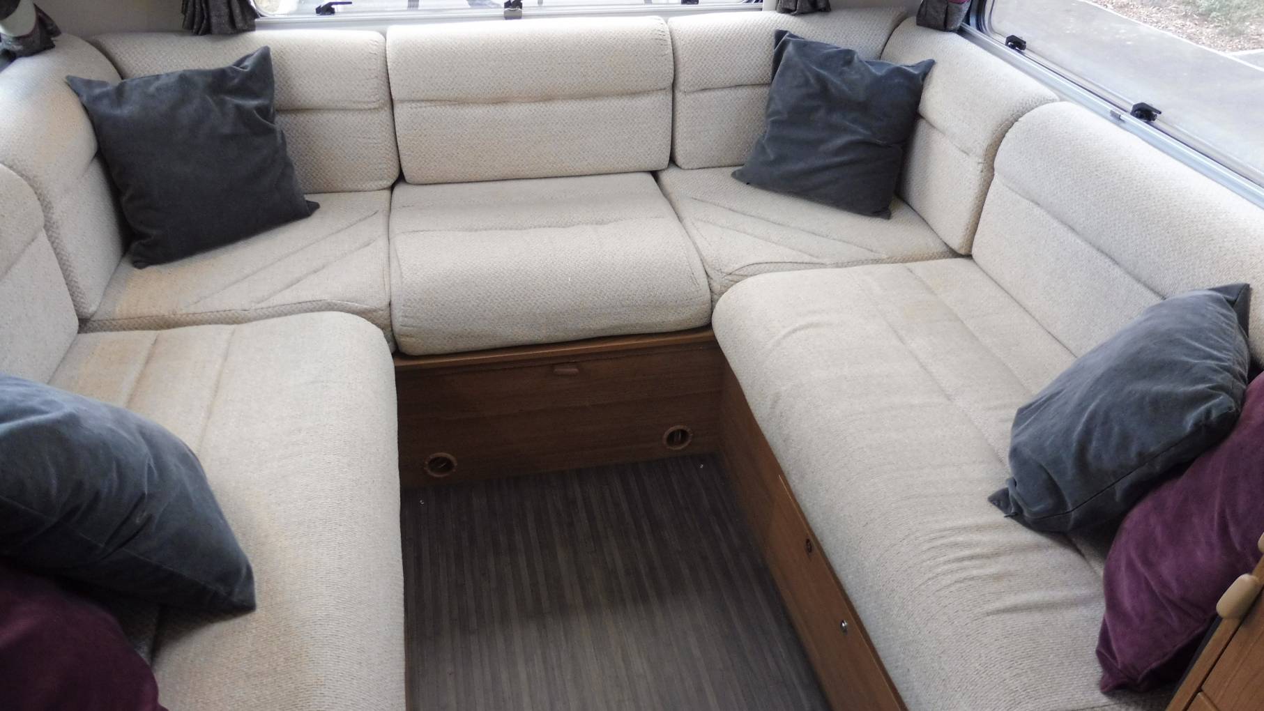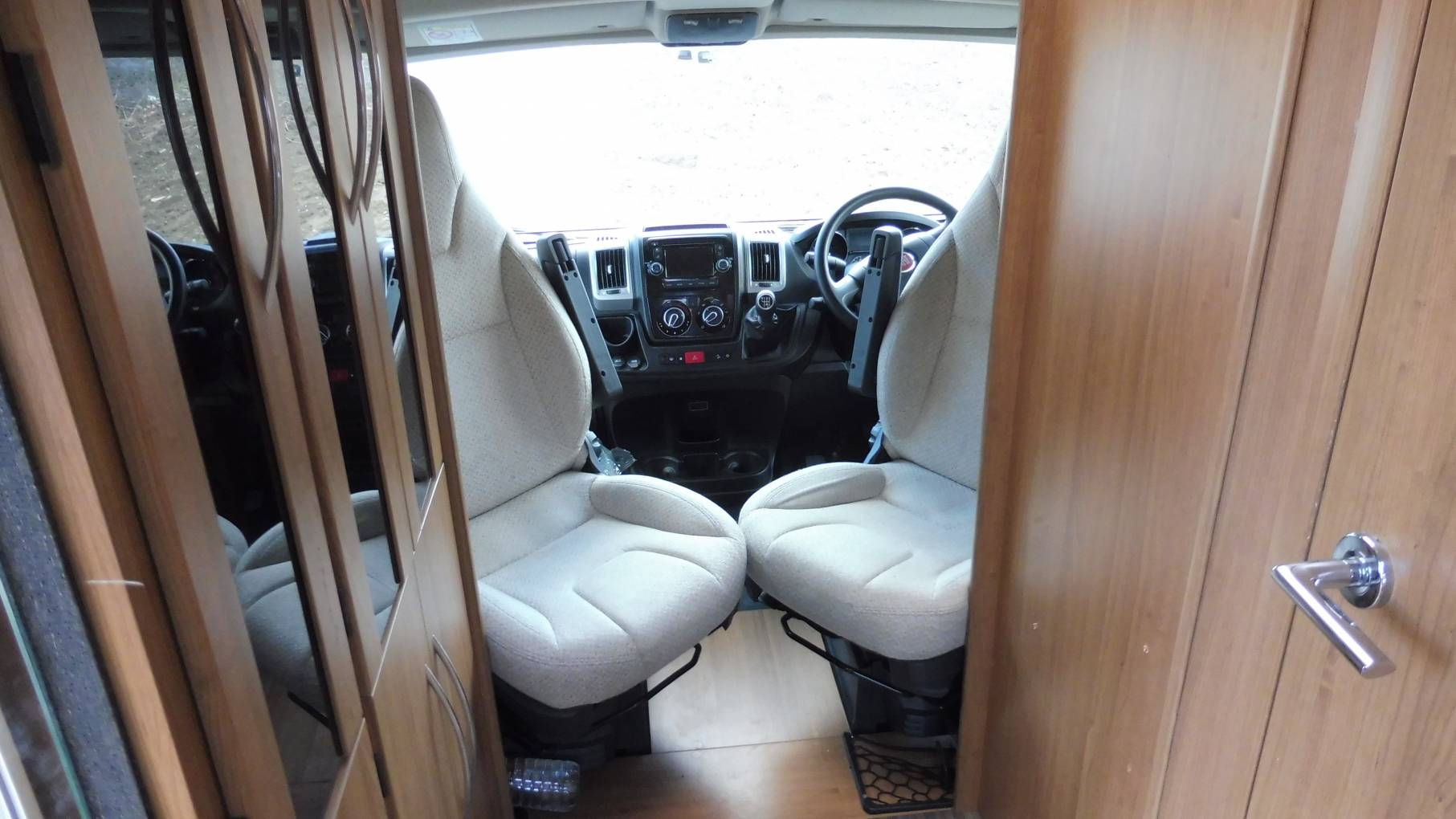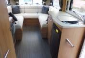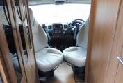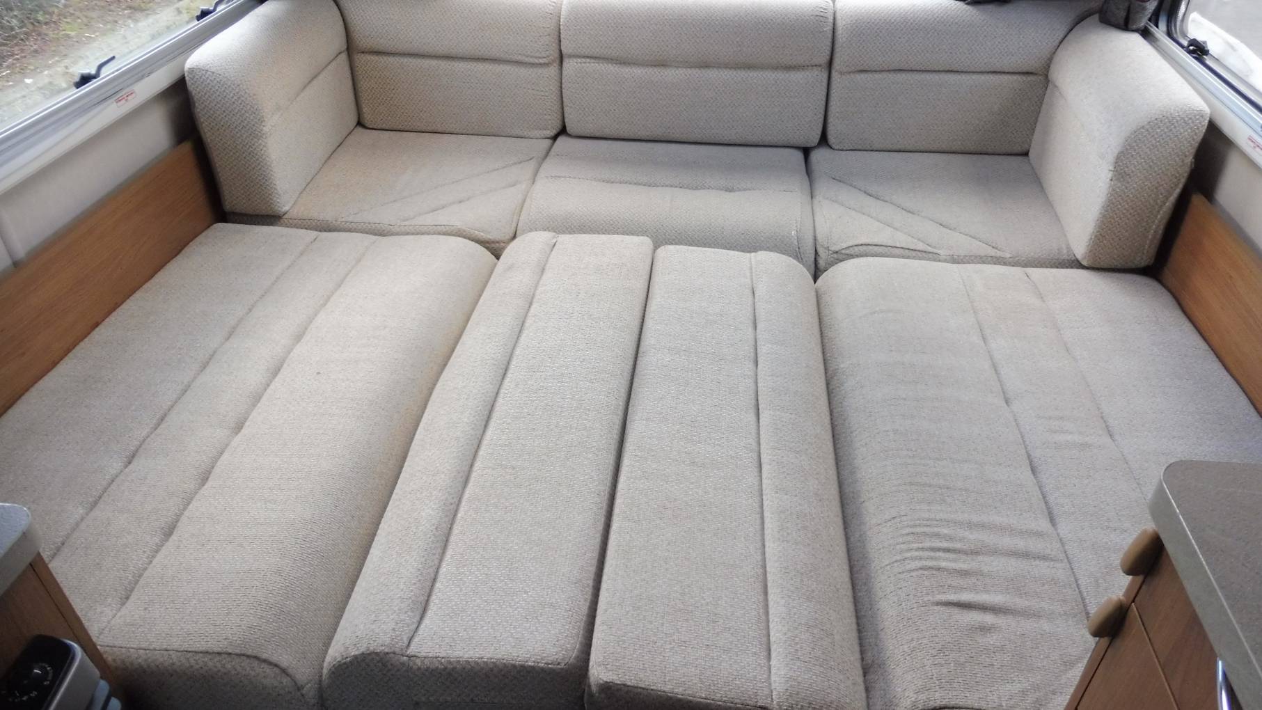 The stand-out feature of this motorhome is the large, bright and airy rear lounge. With all-round windows a delightful space to enjoy the views, even when the great British weather throws its best at you. At night the seating can be quickly converted into a huge double bed, or used as two singles. A television with DVD drops out of one of the overhead lockers and there is a 4G Wi-Fi router offering wider connectivity should you want it.