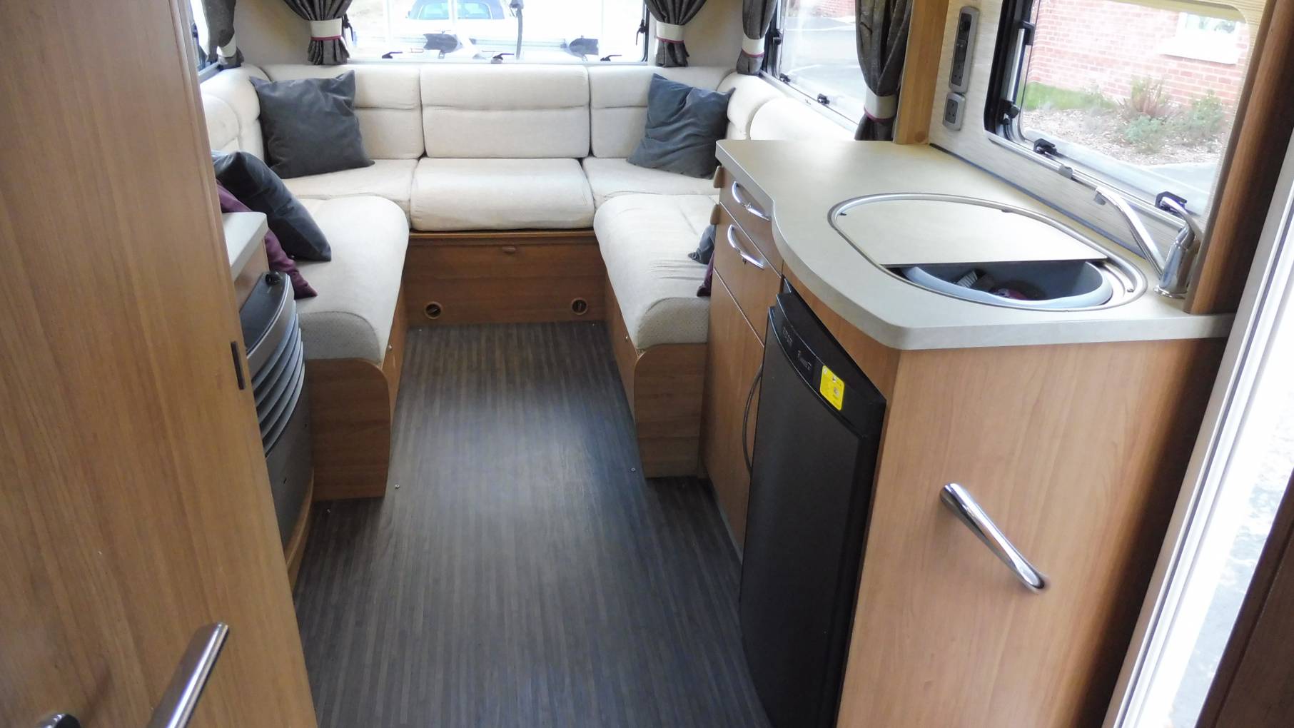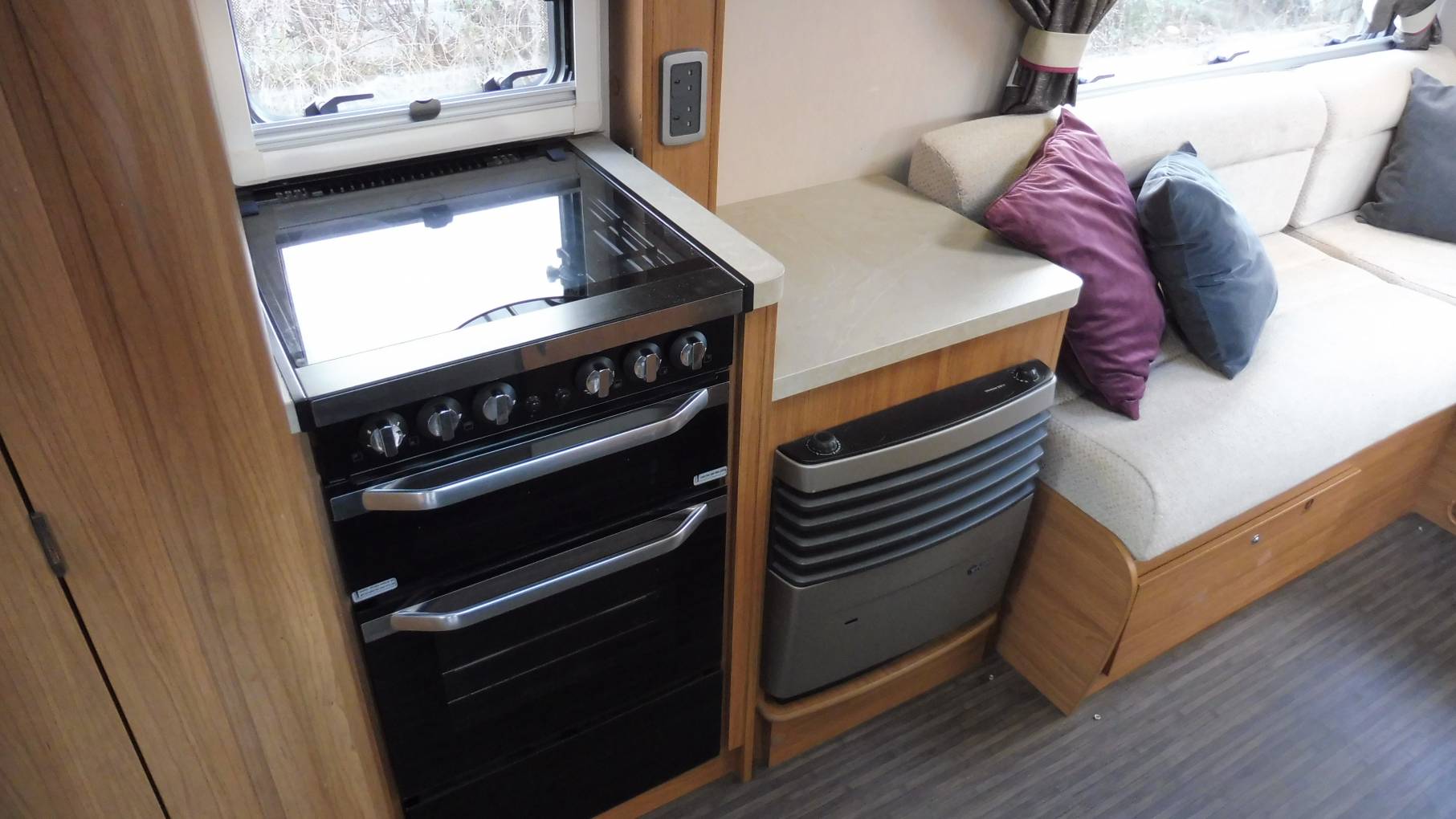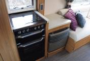 Moving forward the kitchen sit on both sides of the van offering loads of space for meal preparation. There is a dual-fuel hob, full oven with grill, microwave and 3-way fridge, everything you might need to rustle up a light snack of full evening meal.