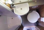 Just behind the cab is a well-sized washroom with vanity sink, cassette toilet and separate shower cubicle. Opposite which is a bank of storage cupboards.