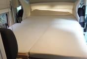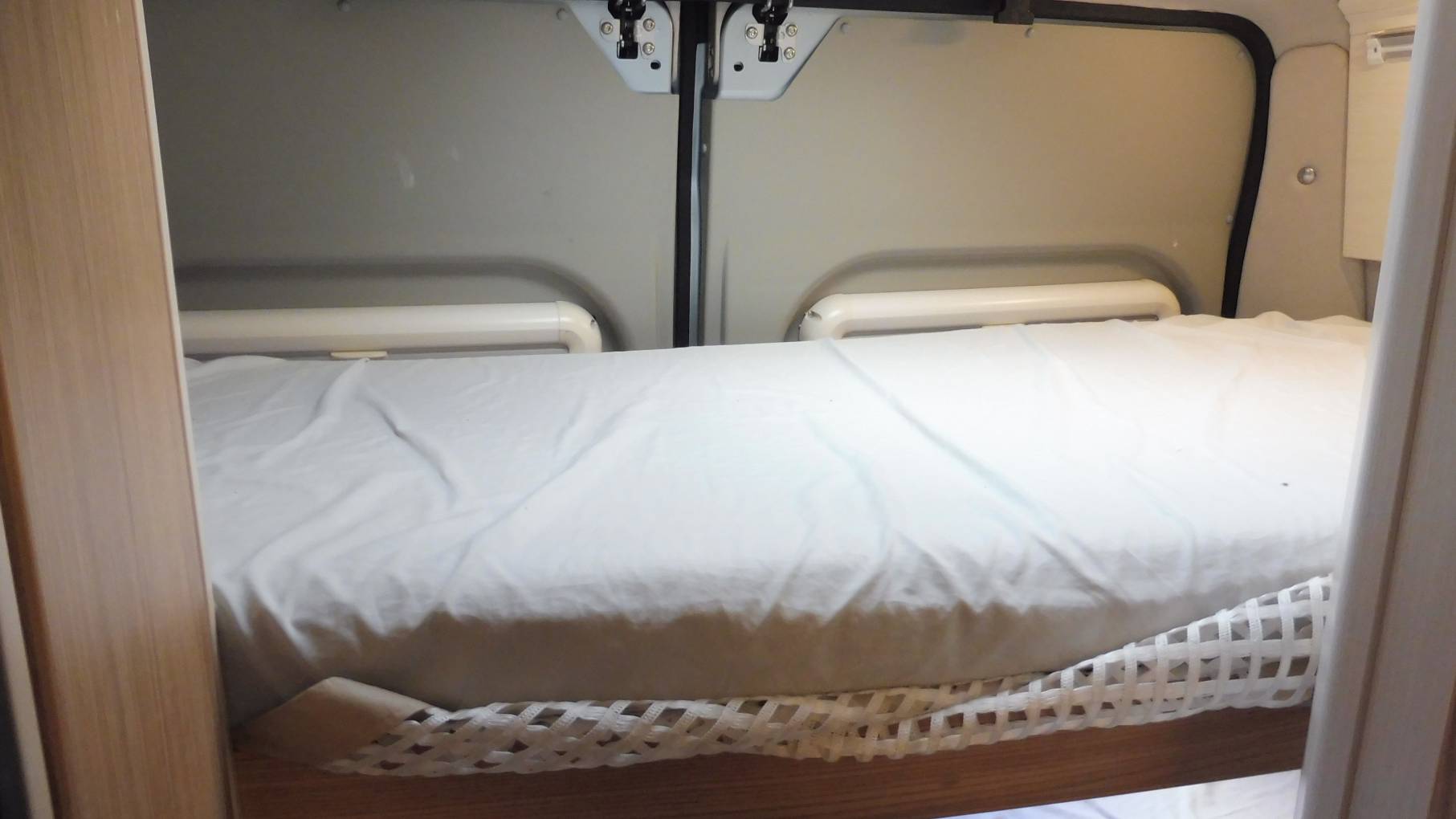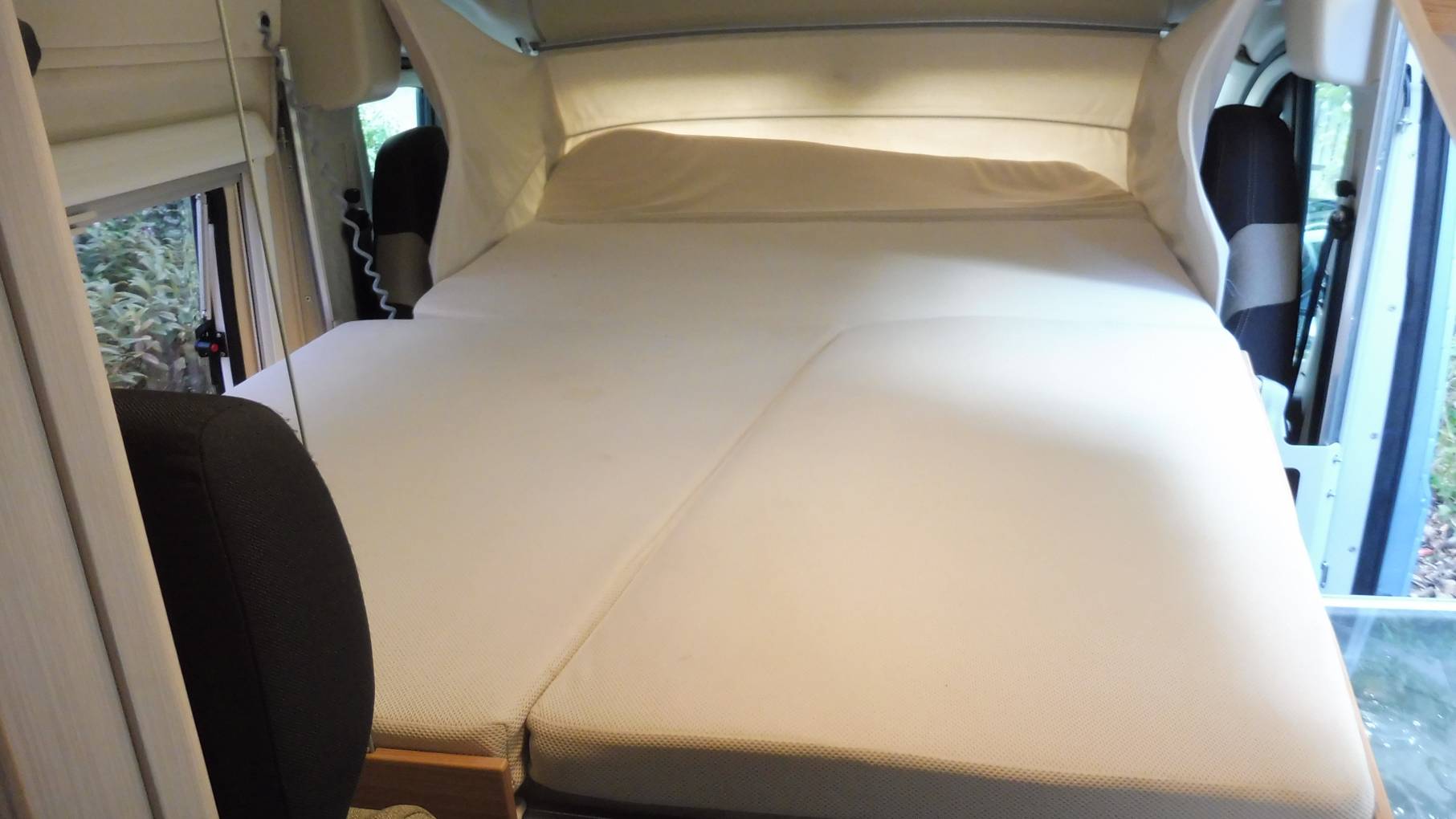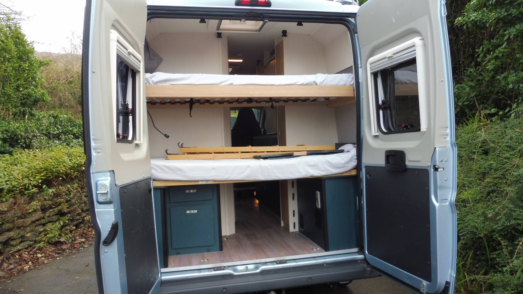 At the rear are bunks capable of sleeping adults comfortably and there is a double bed which drops down over the lounge and cab.