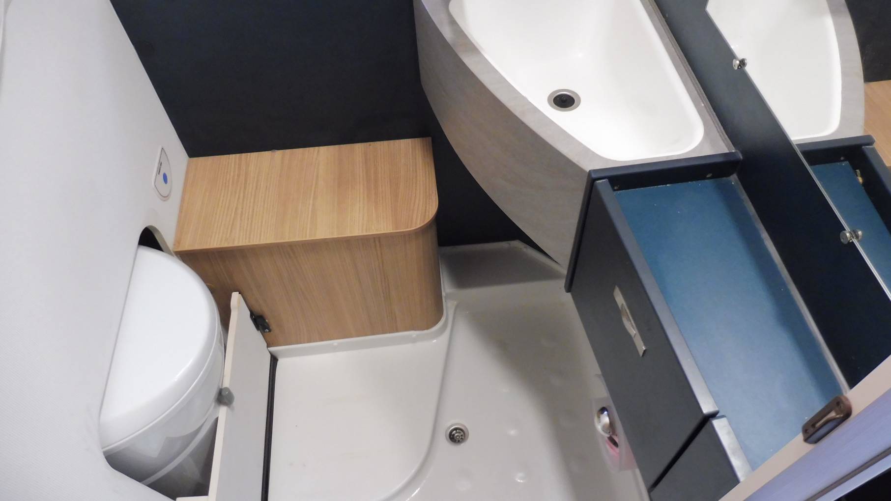 Moving rearwards, the side kitchen features 2-burner hob, sink and compressor fridge. There are various storage options throughout this area including a hanging cupboard for longer items. Opposite which sits a compact washroom with vanity sink unit, space-saving cassette toilet and shower over.