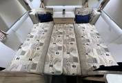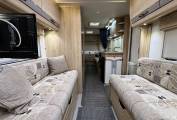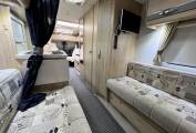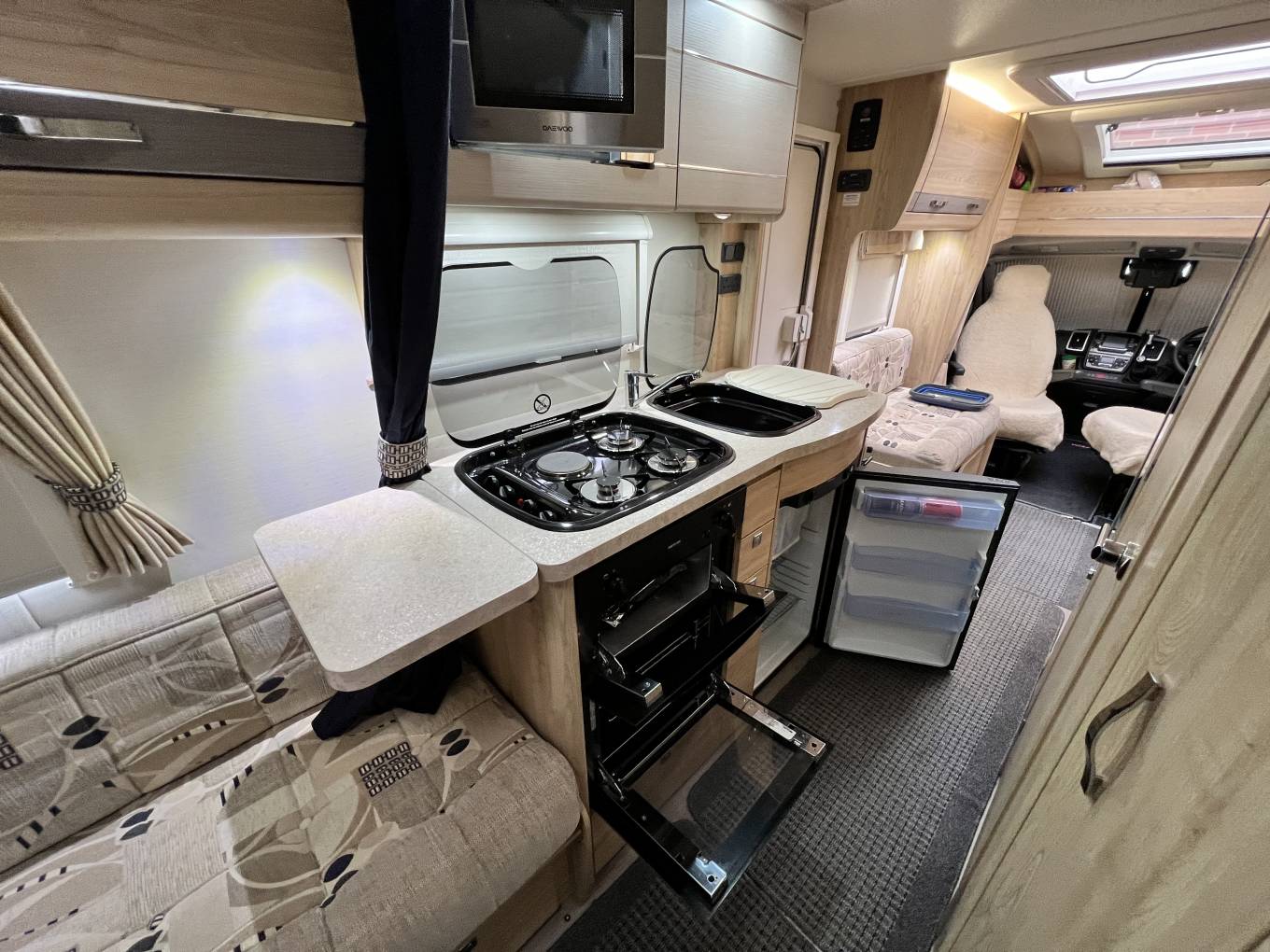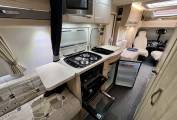 To the right of the entrance door is the extensively equipped kitchen where you will find a Three Gas Burner and One Electric Hotplate Hob, a separate Grill and Oven, a three energy source Dometic fridge, a Microwave Oven, a Sink with hot and cold mixer water taps and a removable drainer, plus an extendable worktop and plenty of cupboard space.