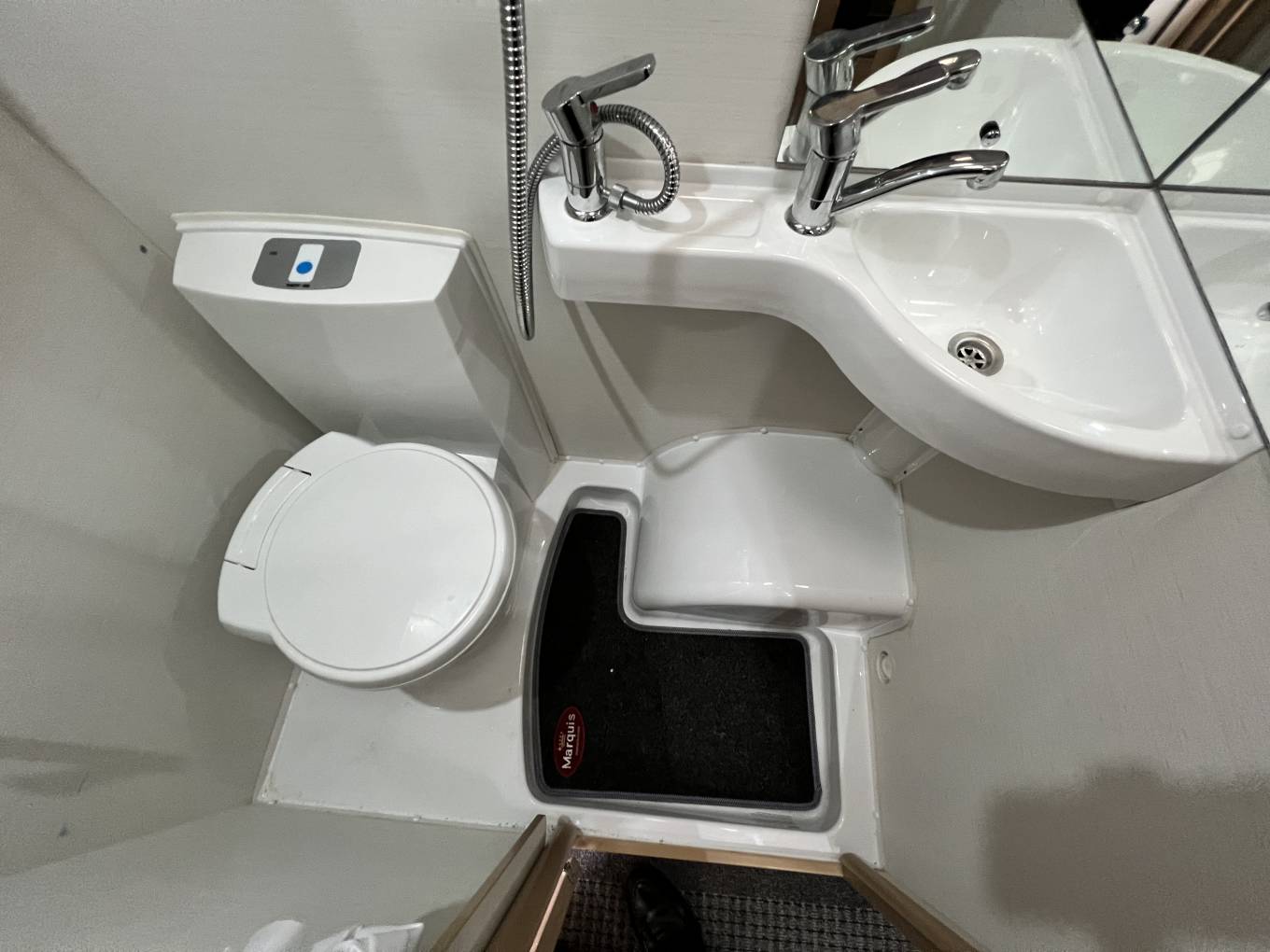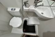 Opposite the kitchen is the bathroom consisting of a Thetford Flush Cassette toilet, a Wash Handbasin and a Shower unit.