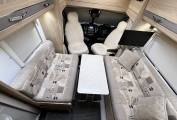 Here there are two inward facing settees, twin swivelling cab chairs and a removable dining table.