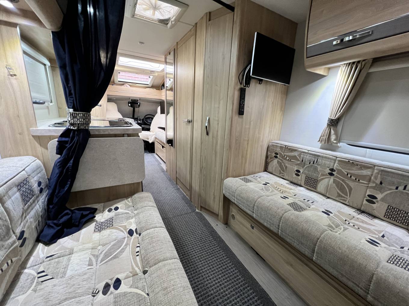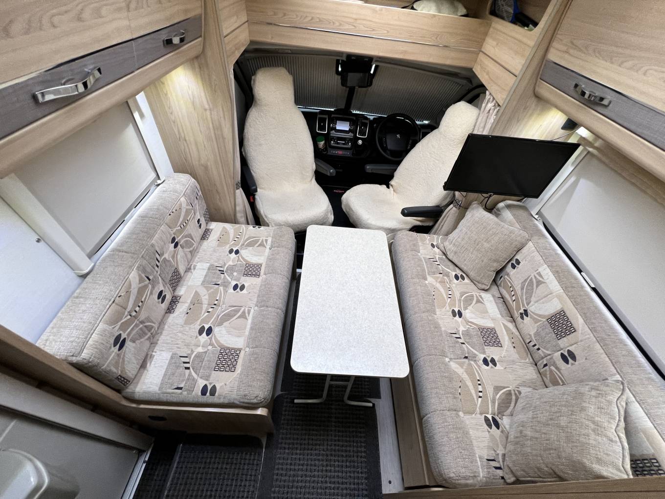 On entering up the electrically operated step via the flyscreen protected habitation door, to your left is the front lounge and dining area.