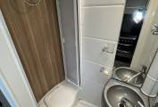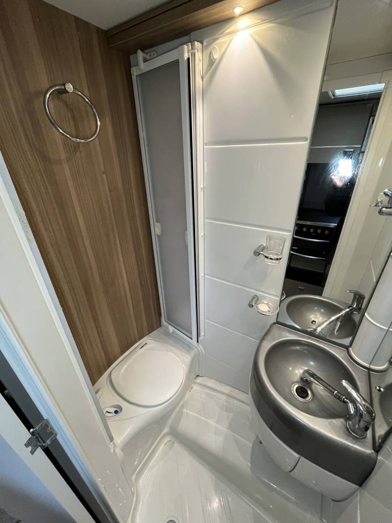 Across from the kitchen is the bathroom. There is a thetford cassette toilet. A sink basin and shower with shower screen.