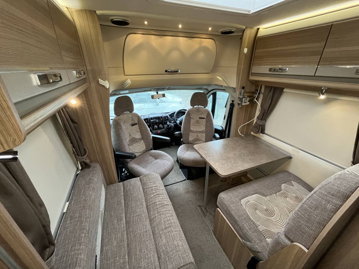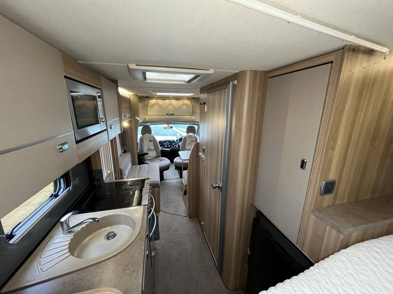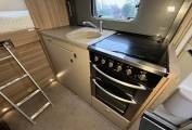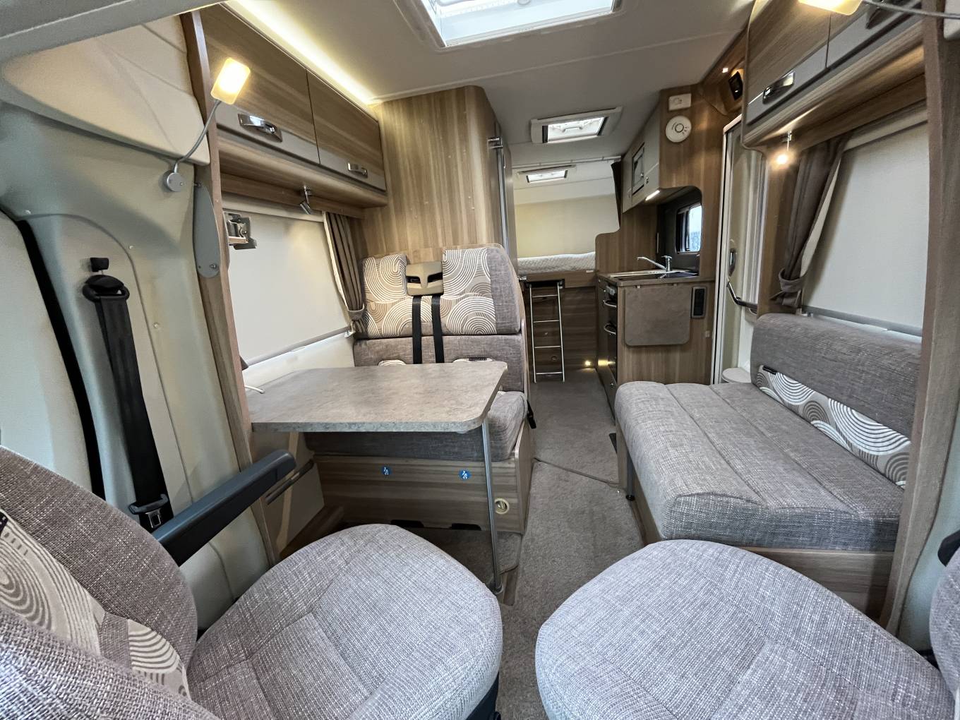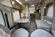 On entering the Motorhome, to your left is the spacious lounge area. In here the two cab seats swivel to extend the living space. The table lowers to make up bed number two. There is plenty of under bed and over head storage. Across the centre of the Motorhome is the fully equipped kitchen that consists of a three gas burner and one electric plate hob, a separate oven and grill, a microwave, fridge freezer.