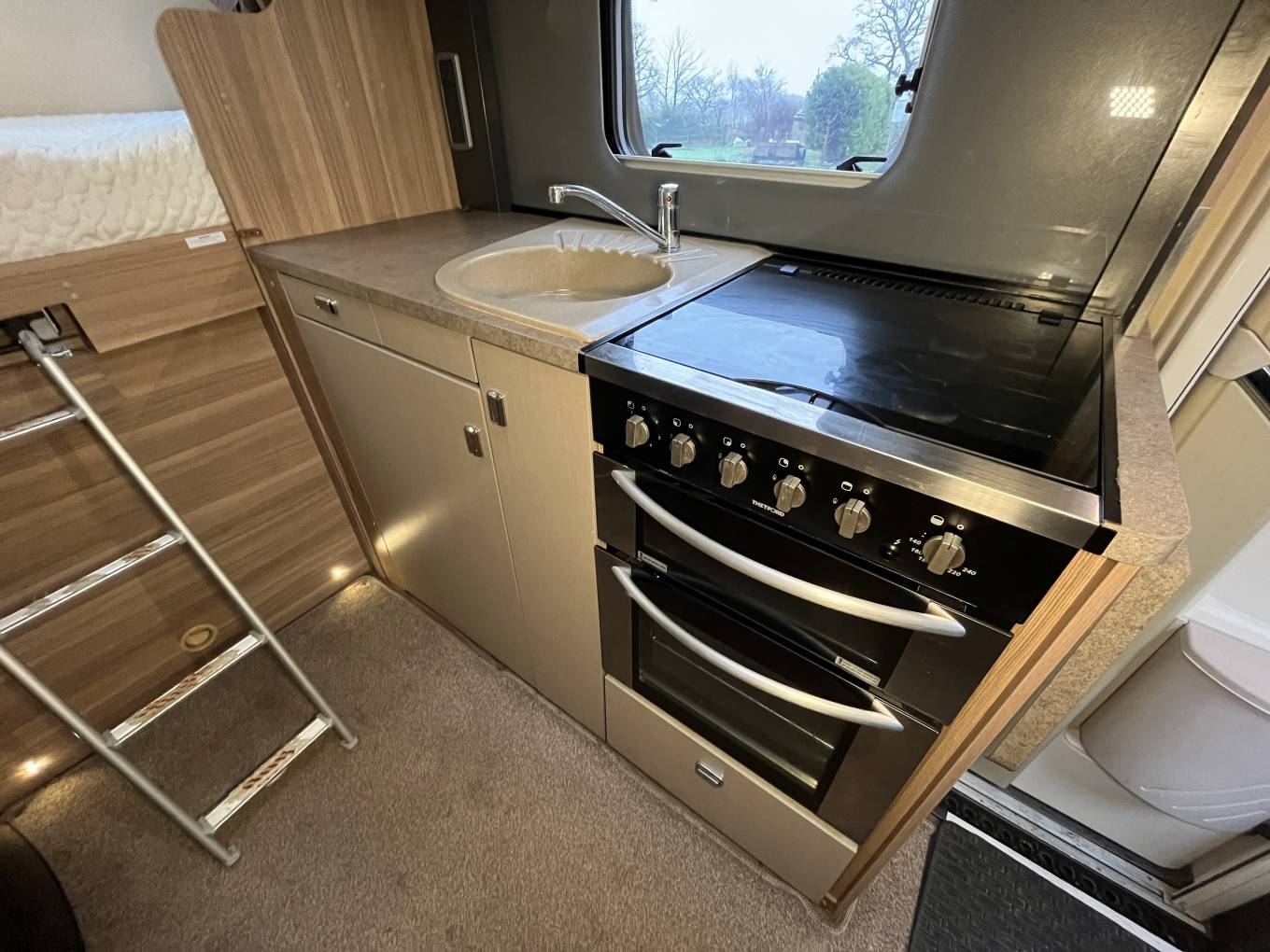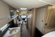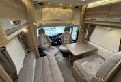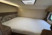 Towards the back of the Motorhome is a bed that stretches across the full width of the Motorhome, accessed by ladders. The bed being raised allows for a large garage space, a popular layout for Motorhome owners.