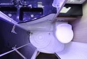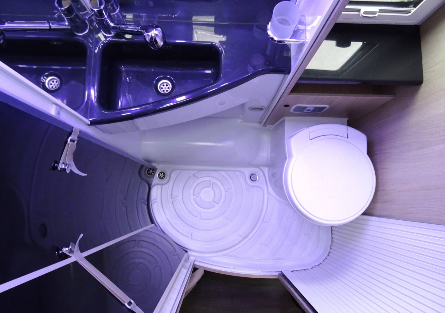 Opposite the kitchen is the all in one bathroom which has a very modern feel to it. It consists of a cassette style Thetford fresh water flush toilet which has a swivel head and a grey wash hand basin above with chrome mixer tap. The shower head is pulled from the tap and fixed above for showering and the shower screen rotates to keep the toilet dry whilst in use.
