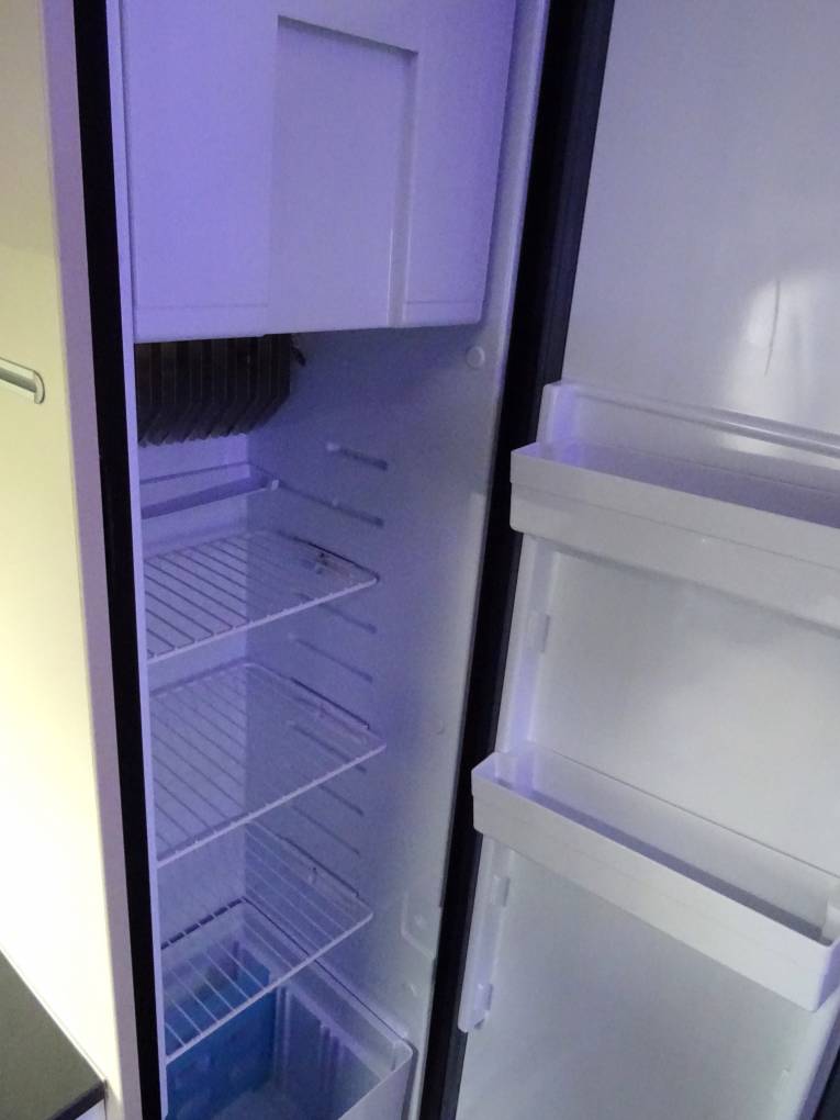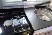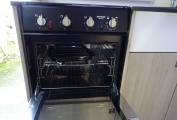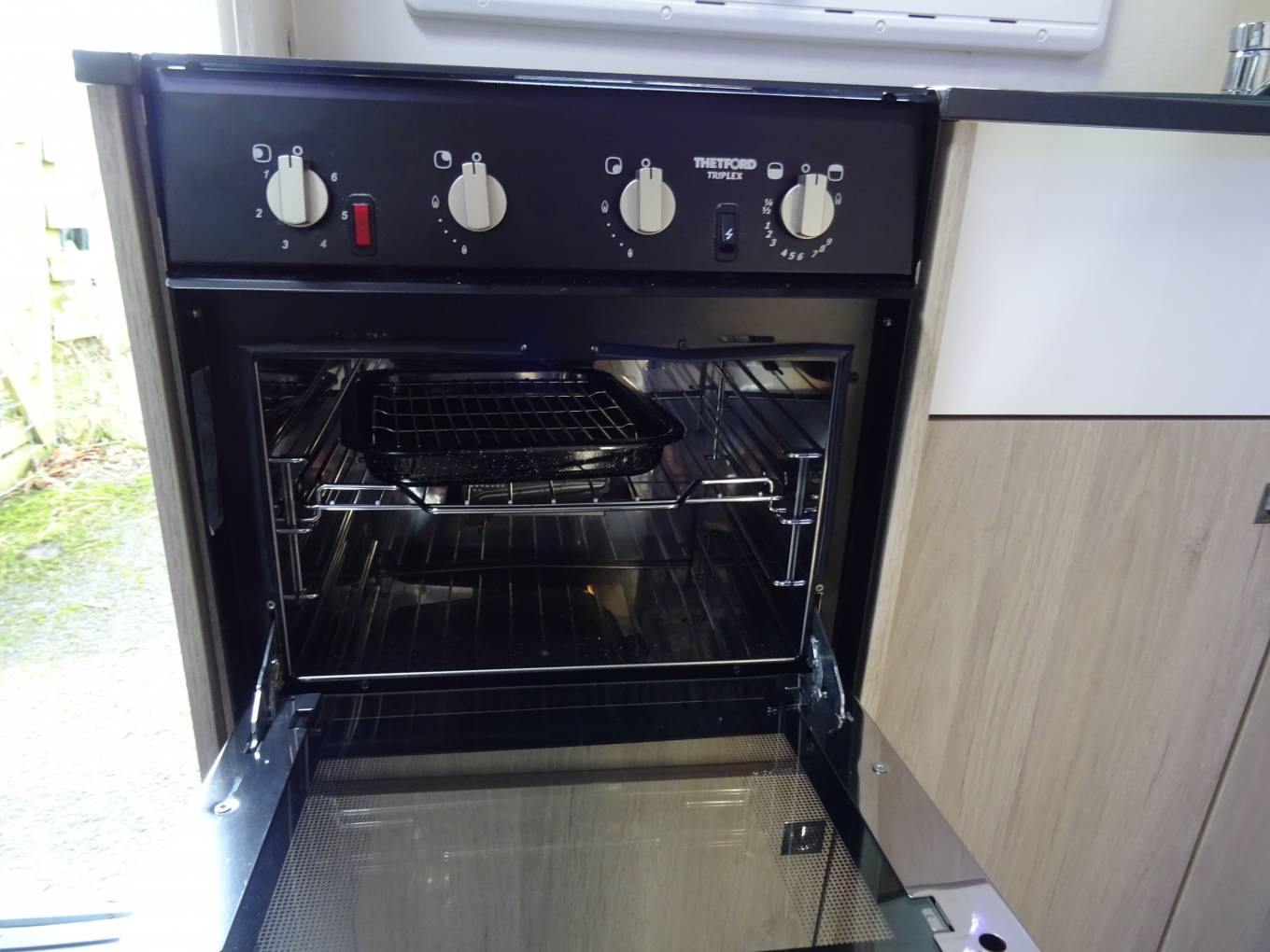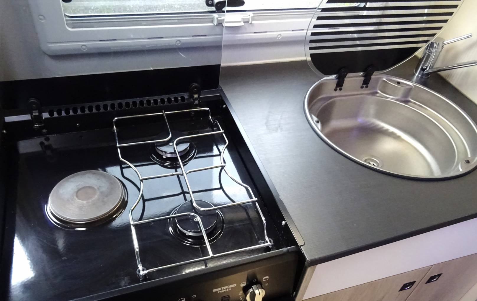 Moving rear is the galley kitchen which consists of a Thetford oven & grill with 3 a burner hob, 2 gas and one electric hot plate for use while plugged in on site. To the right is a stainless steel sink with chrome mixer tap. There is ample drawer and cupboard space for all your holiday provisions. There is a large 3 way fridge with freezer box that can be powered by 240v,12v or gas depending whether you are plugged in on site or wild camping.