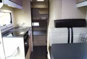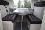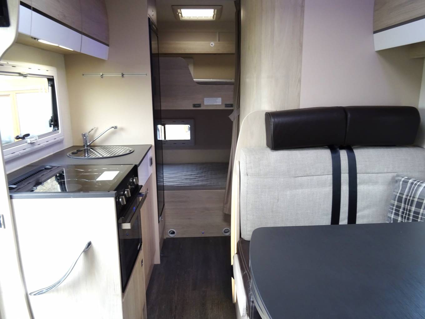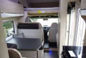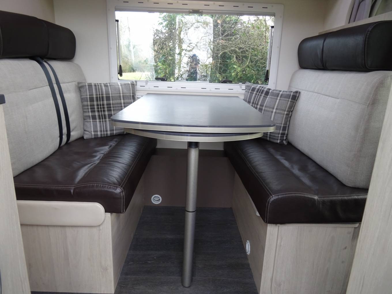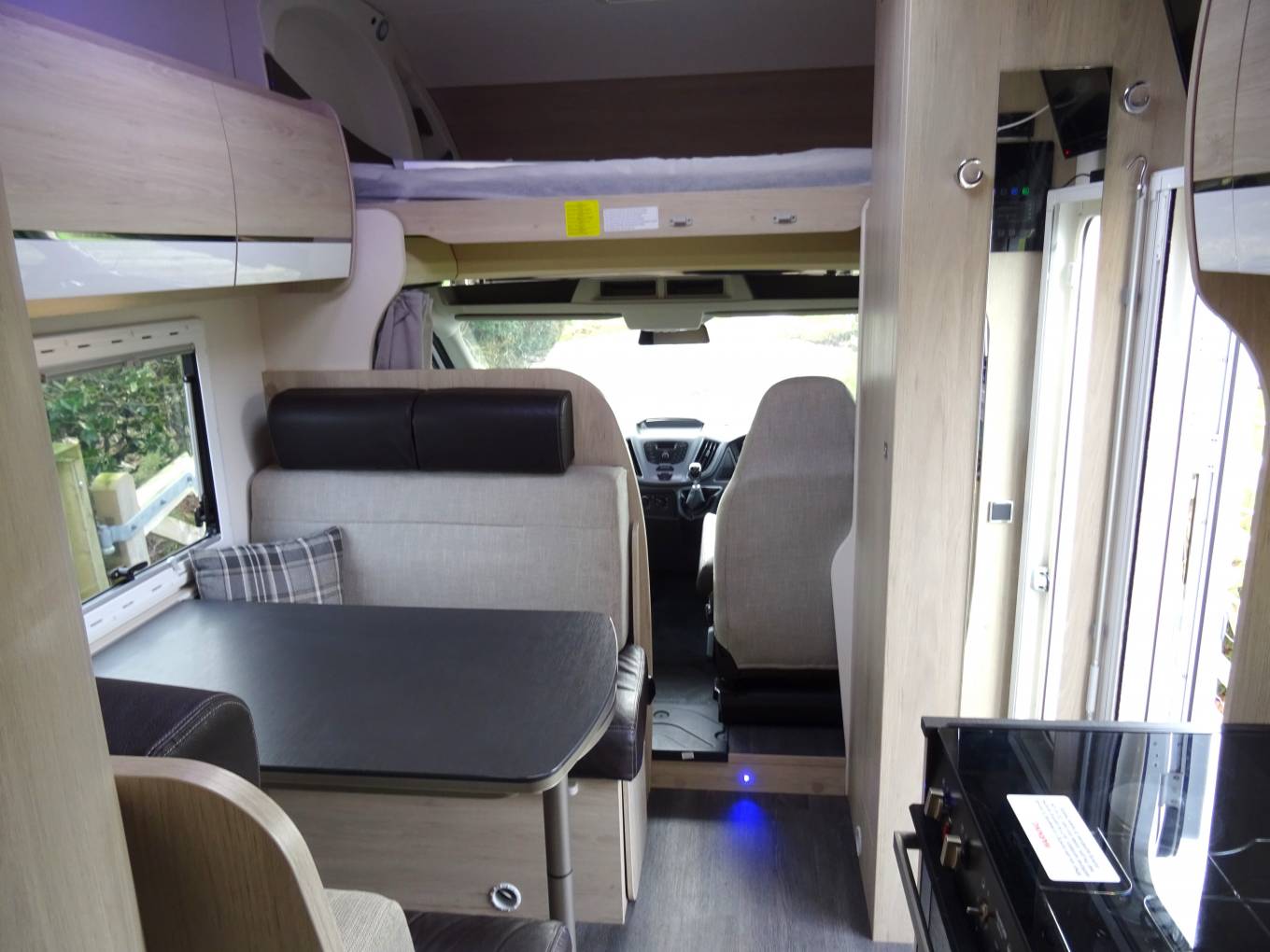 We enter the motorhome on the near side via a low step immediately ahead is the dinette which has forward and rear facing 2 seater sofas around a fixed table. The forward facing sofa has 2 x 3 point lap and diagonal seat belts, the rear facing has 2 lap belts. Both the table and the sofa can be extended to accommodate more guests depending on your requirements. The table drops down to make a double bed with the use of some infill cushions. There is a large hanging wardrobe to the right of the habitation door and a TV point with Flat screen tv and 12v control panel over the habitation door.