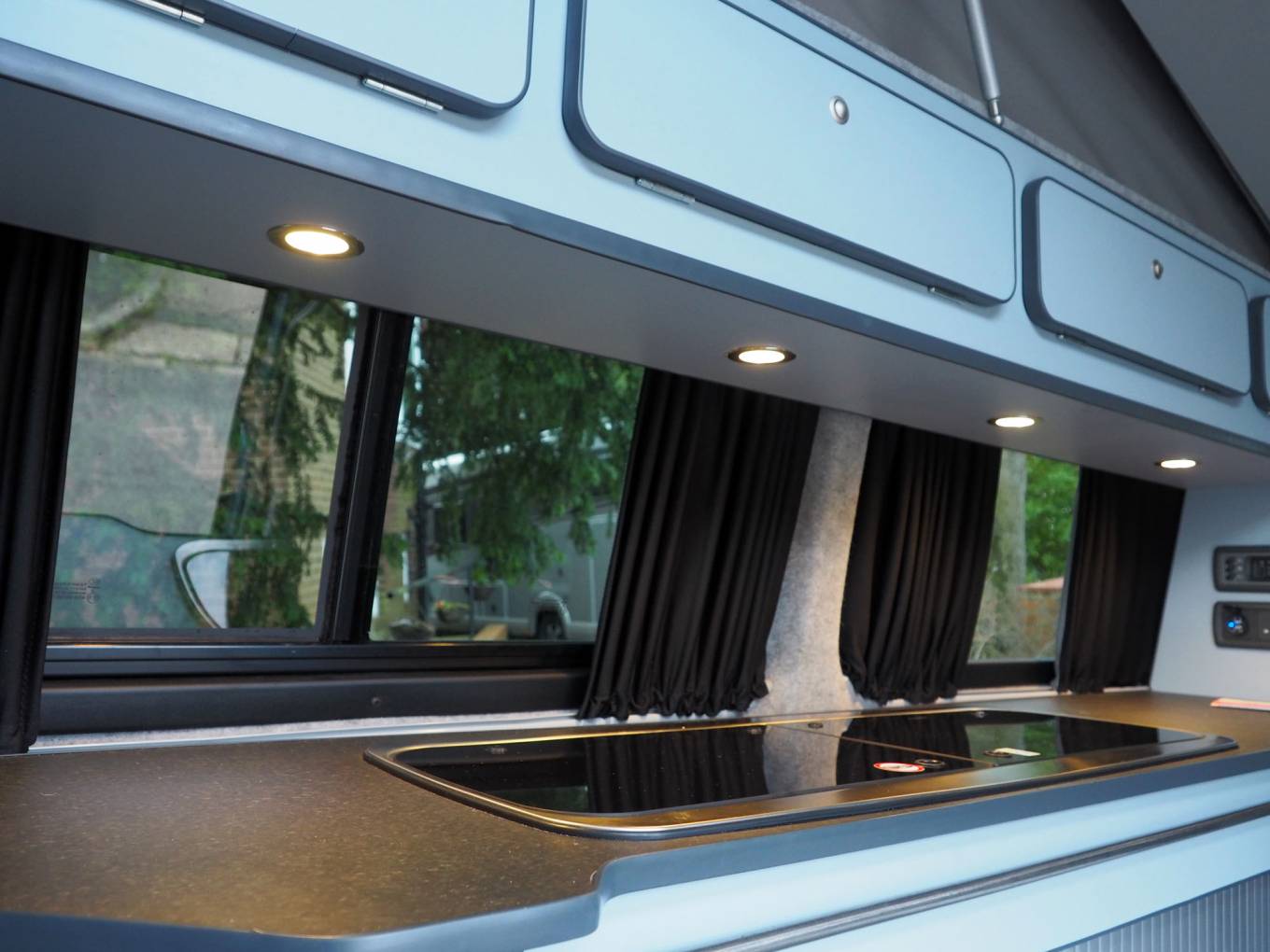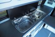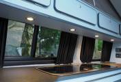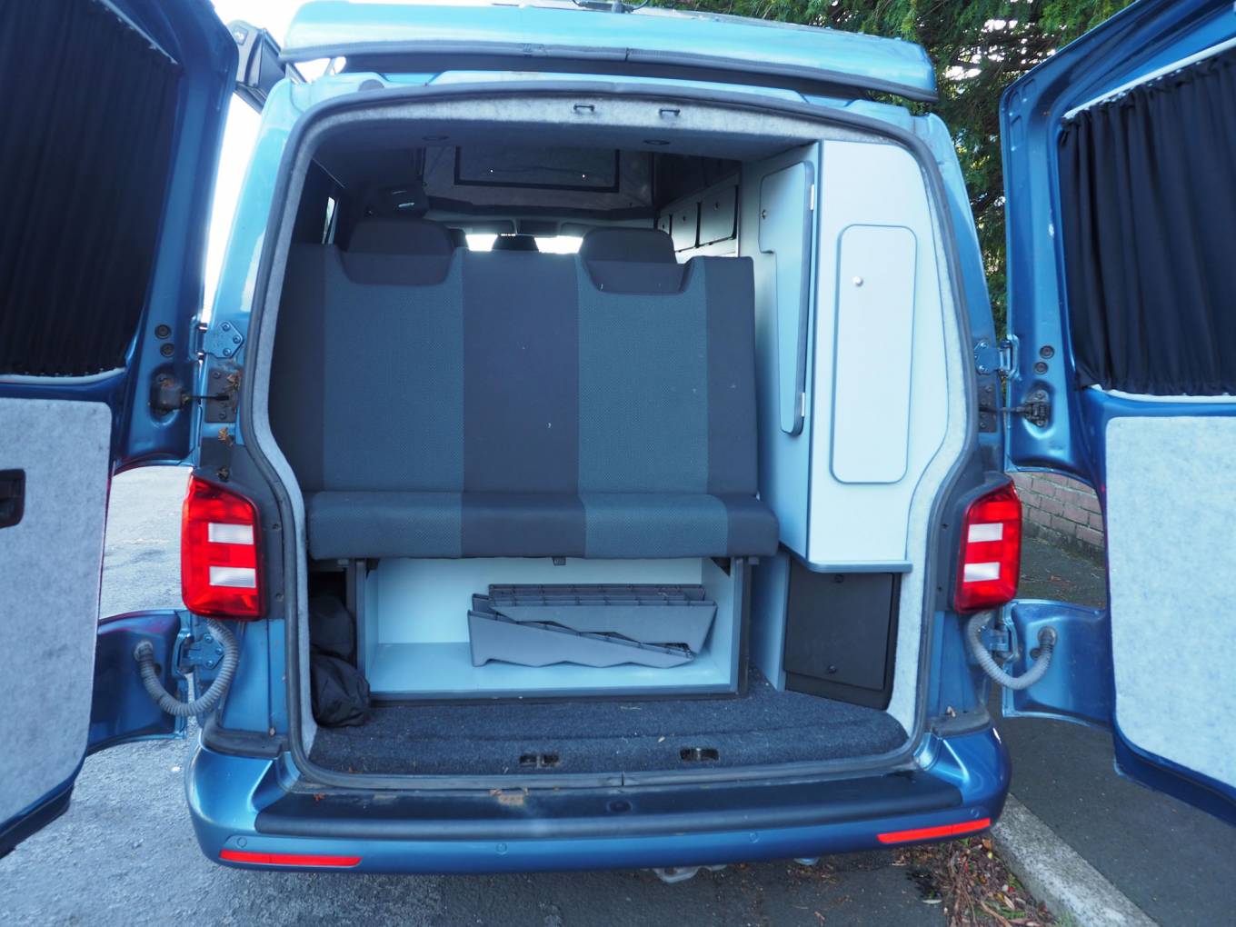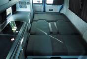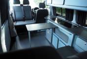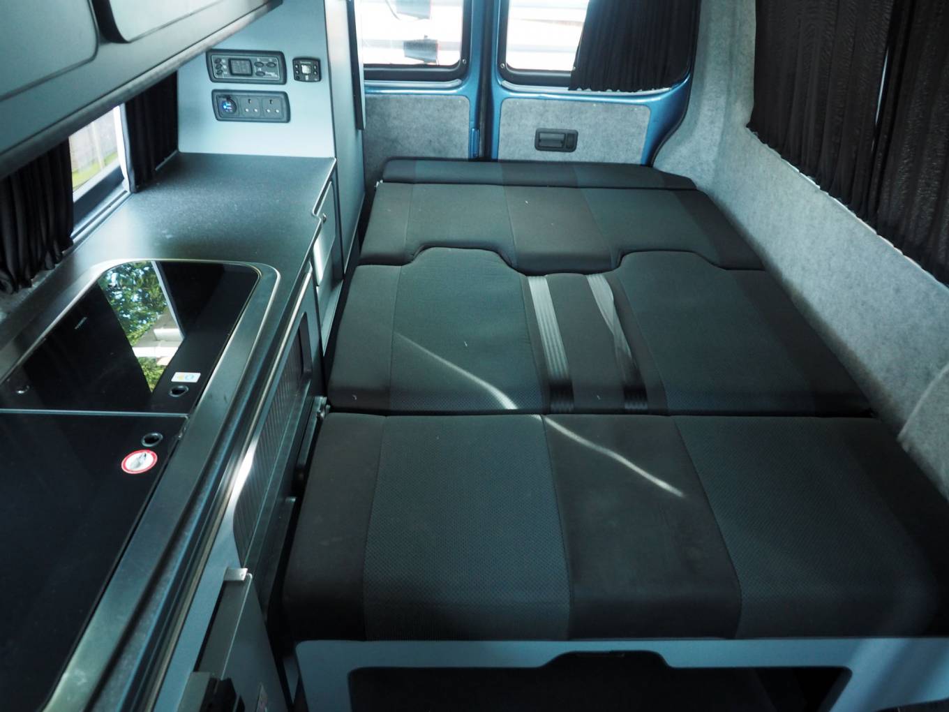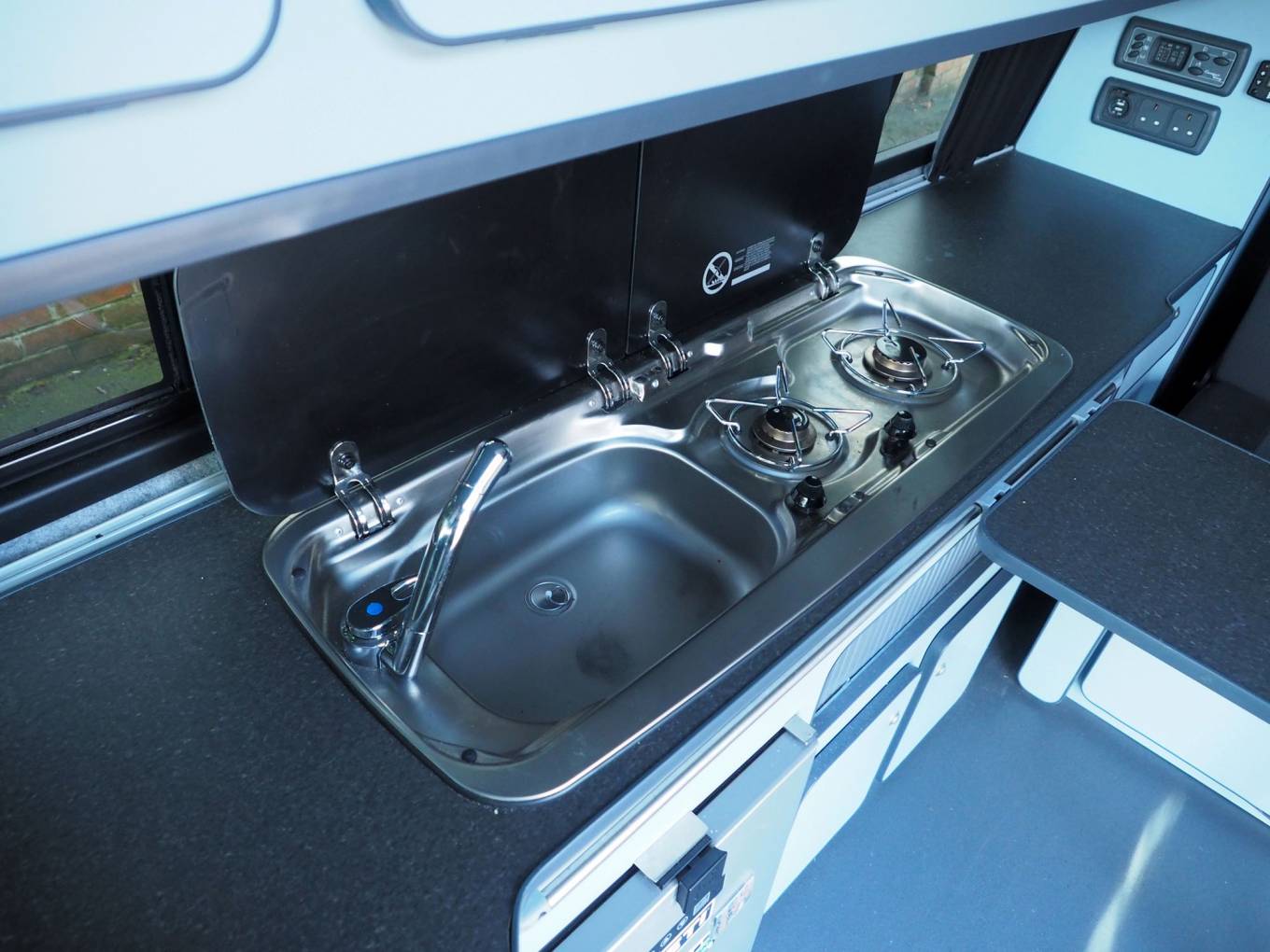 The interior is nicely fitted out by Expedition Campers to a high standard with excellent storage, flush fit lighting, full electrics with leisure battery and charger, 2 burner hob, gas bottle, cold water system. Rock and roll rear bed assembly is very straightforward to make up. Hook on dinette table slides to desired position. There are 5 seatbelts in total.