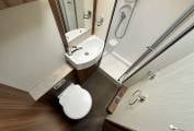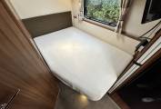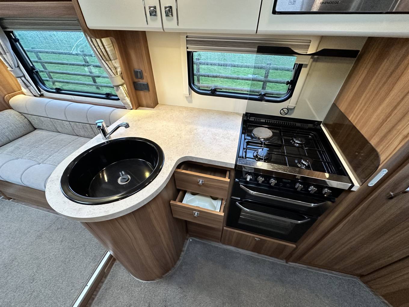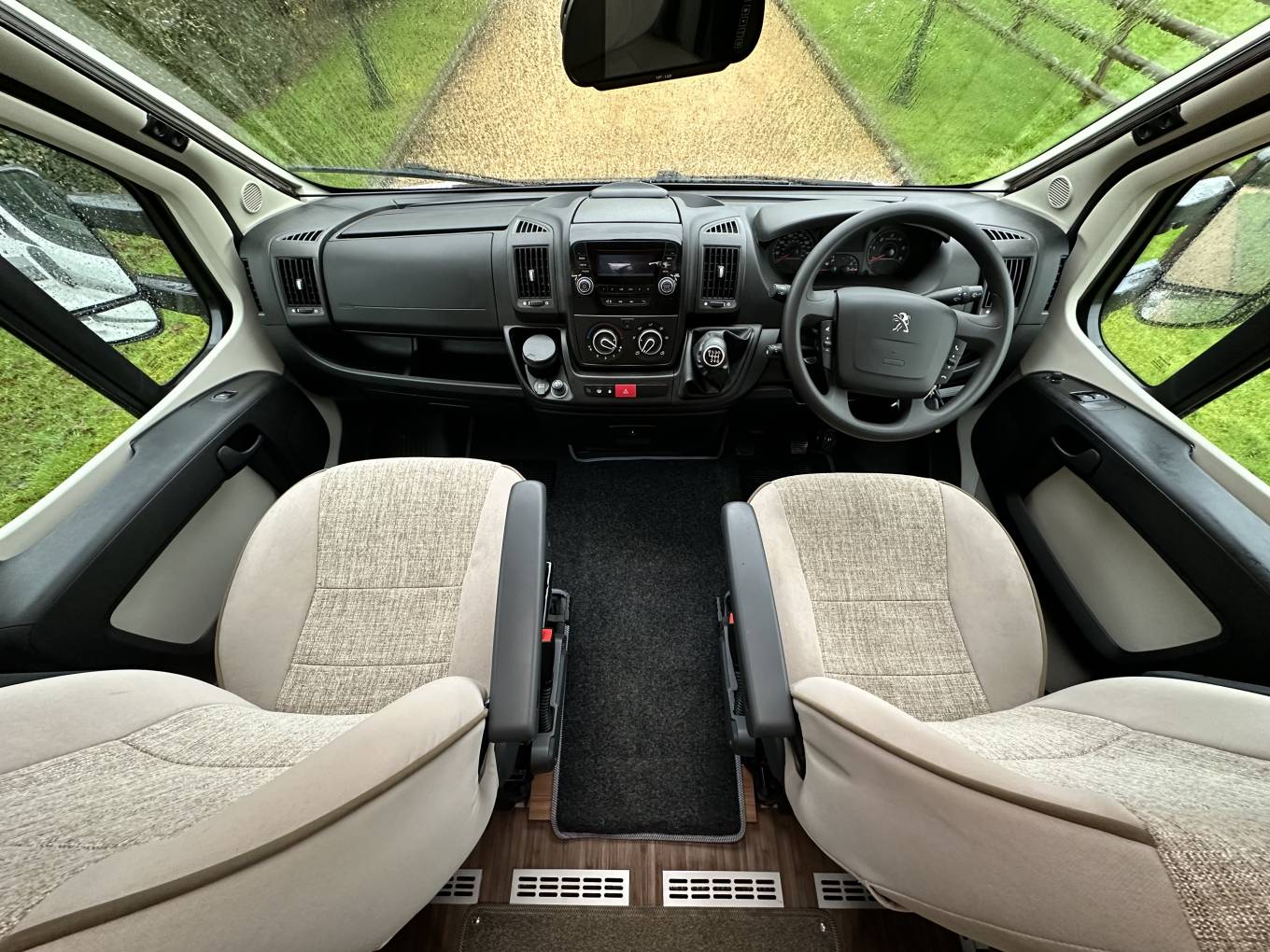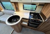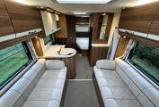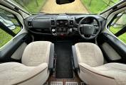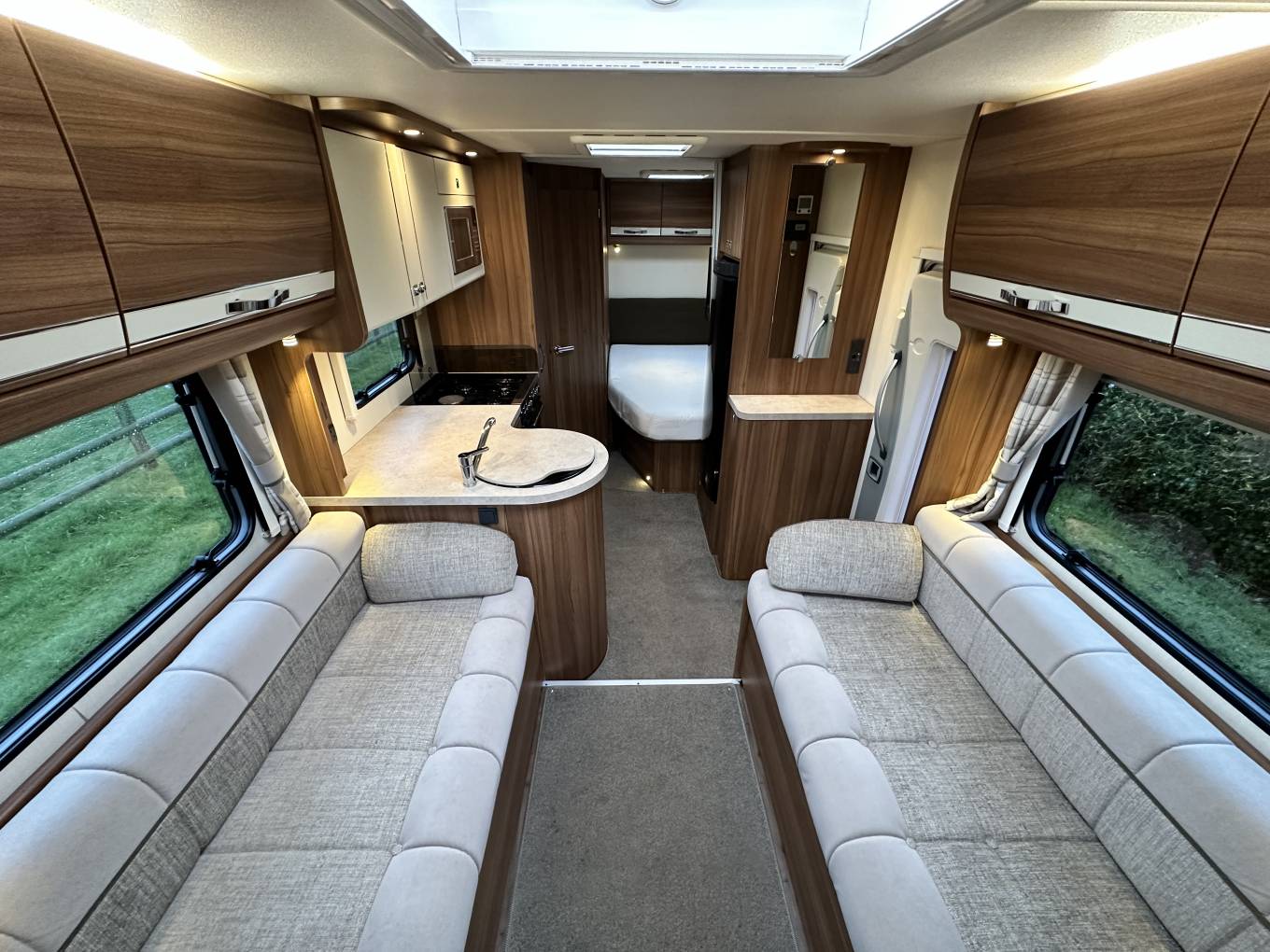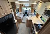 To the rear is a huge double bed and a large washroom. The washroom is complete with separate shower cubicle, toilet and wash basin. The rear also features a room divider for extra privacy. Next, is the well equipped kitchen. This includes a gas hob, electric hot plate, large 3 way fridge freezer, oven, grill, wash basin and lots of storage. To the front is the dinette, this is the perfect place to relax and seats 4-6 comfortably with 2 swivel cab seats. The dinette also converts to a double bed and features 2 fold out seats complete with 3 point belts.