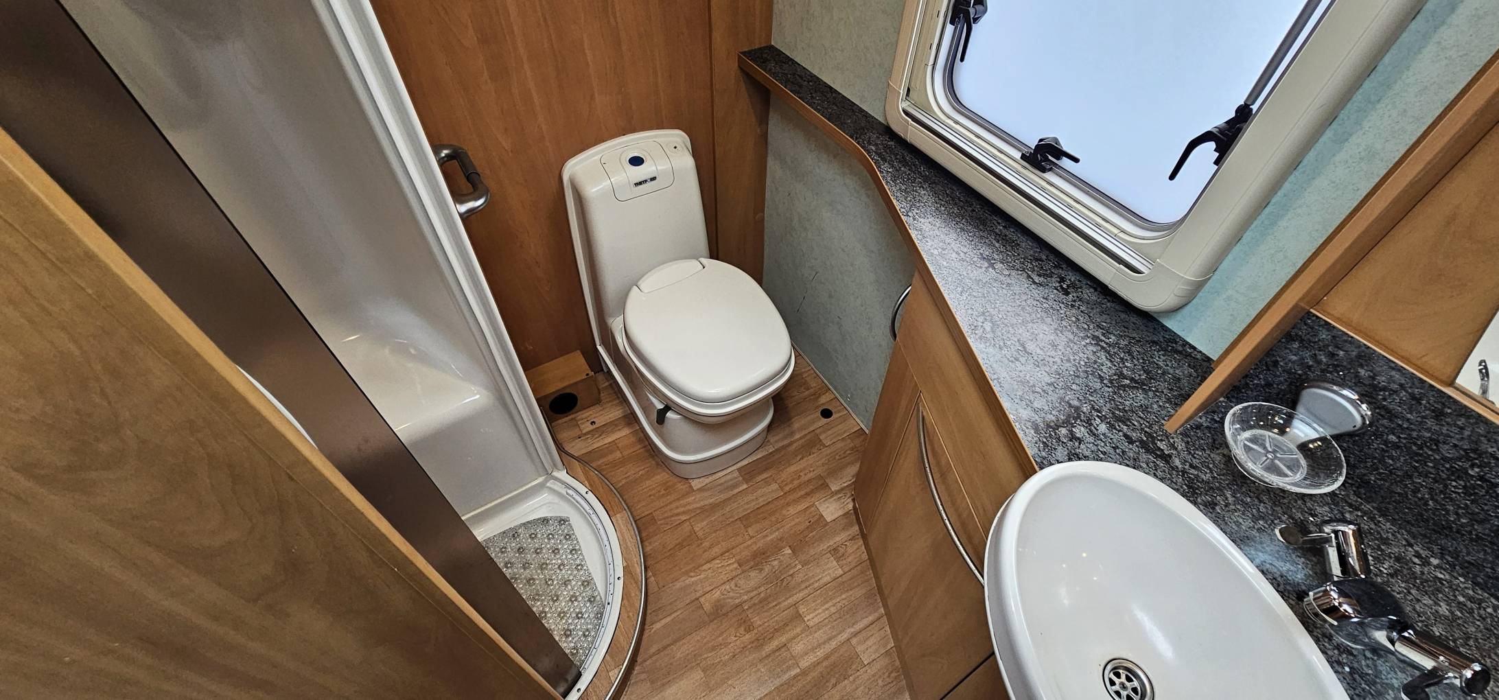 separate shower cubicle, Thetford flush toilet and vanity sink with space to