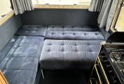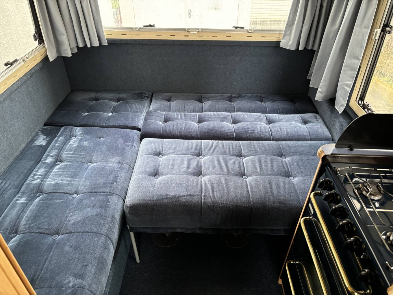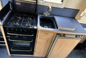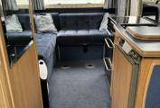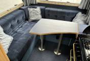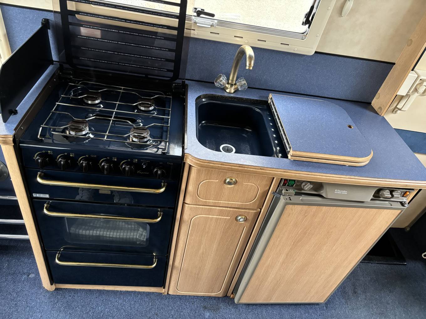 To the right as you enter is a rear L-shaped lounge with a fold away table which converts into a double bed and plenty of storage space below as well as in the overhead cupboards. Next to this is a centre kitchen fully fitted with 4 hobs, oven, grill, fridge and a couple more cupboards.