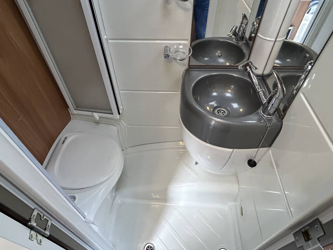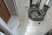 The washroom is well equipped and has a Thetford cassette toilet, a shower, a wash basin with a mixer tap and a large mirror.