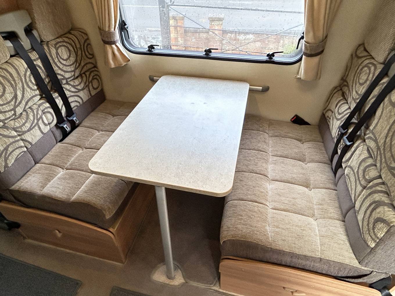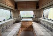 Opposite the kitchen is the second lounge dinette with forward and rear facing 2 seater sofas both of which have 2 seat belts each. The dining table fixes on to a side rail and this can easily be removed if you want more space when travelling.