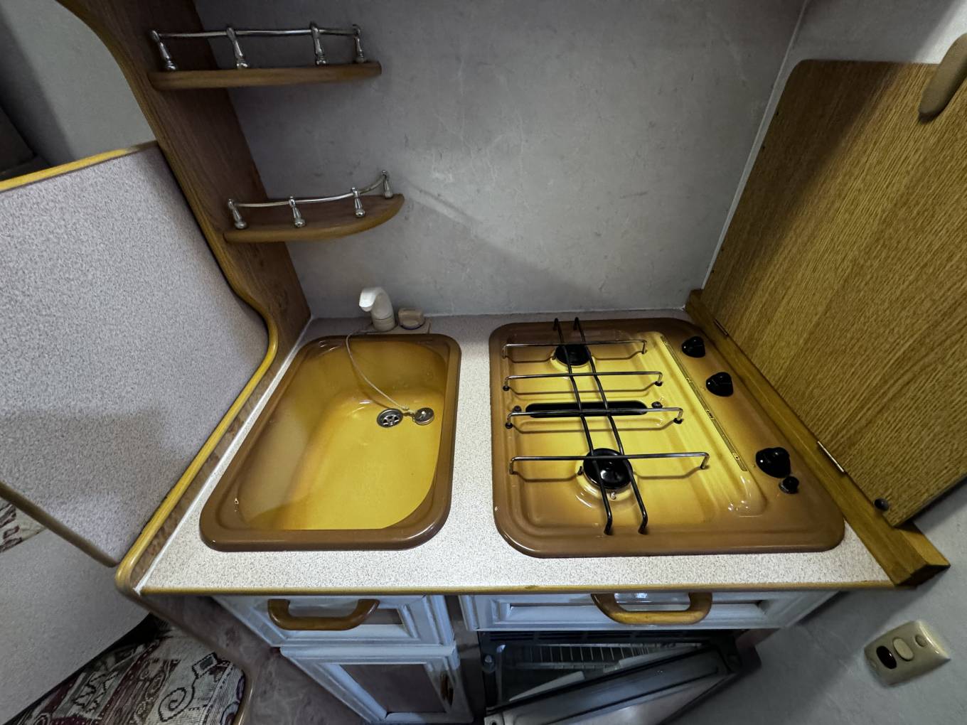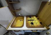 On the right of the entrance door is the kitchen where you will find a Two Burner Gas Hob, a Grill, a Three Energy Source Electrolux Fridge, a sink with water supply, a fold out worktop extension and ample cupboard space.