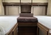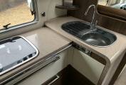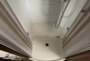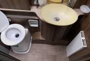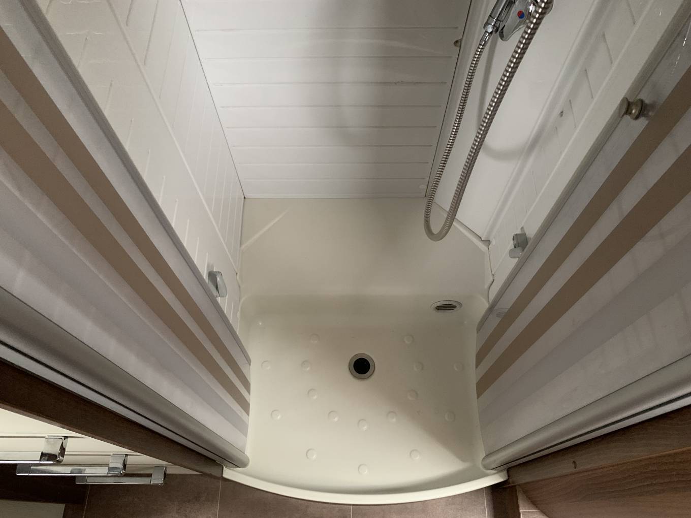 At the foot of the bed a generous shower cubicle on the drivers side, a wash basin and a Dometic electric flush cassette toilet on the passenger side. The bedroom can be closed off providing privacy from the rest of the habitation,