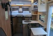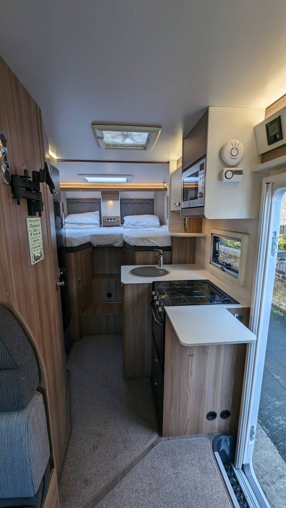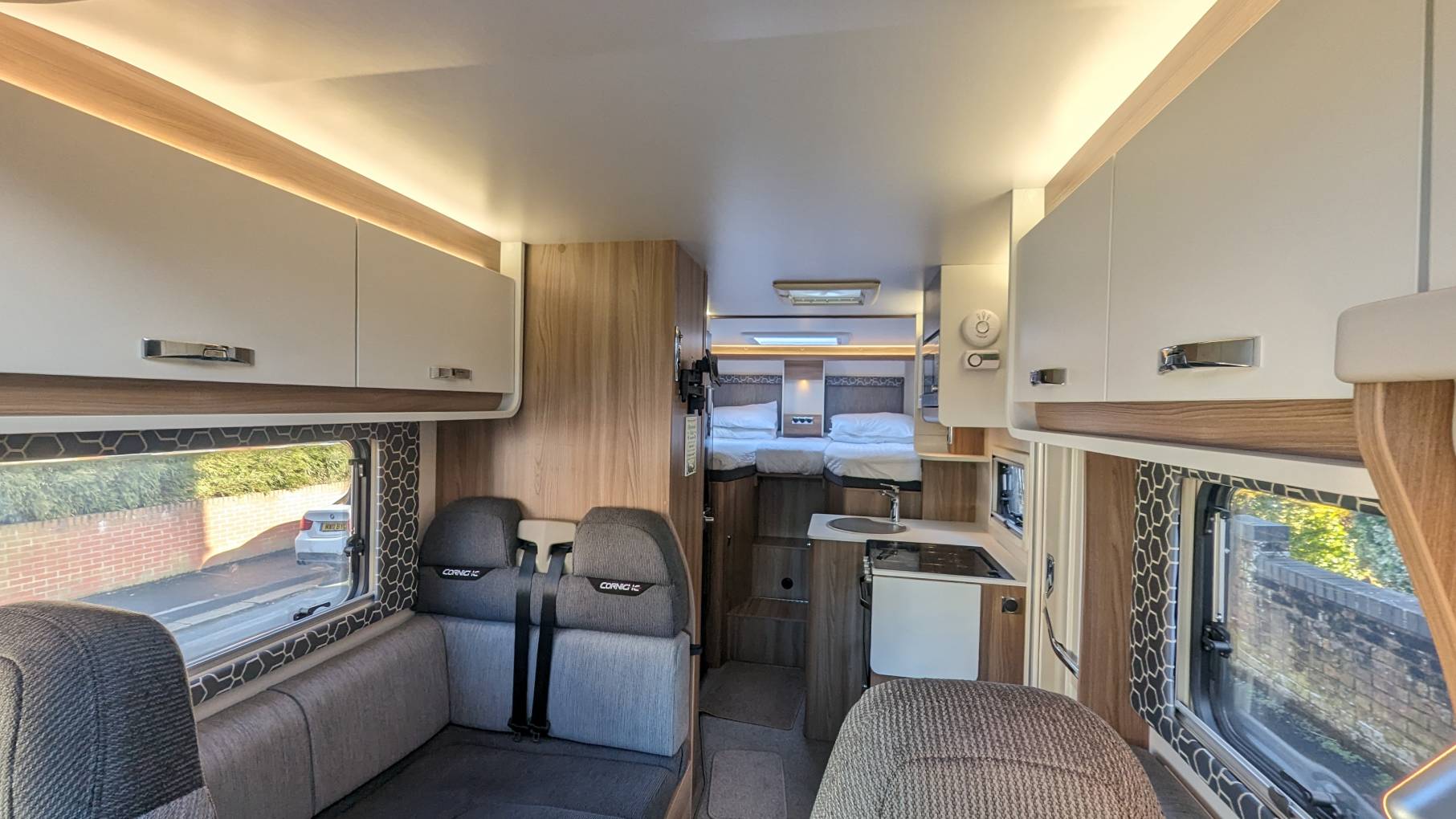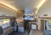 Enter into a world of relaxation and adventure. Towards the rear, a raised bed beckons, offering either two single beds or a luxurious transverse double, complete with wardrobe space below.