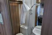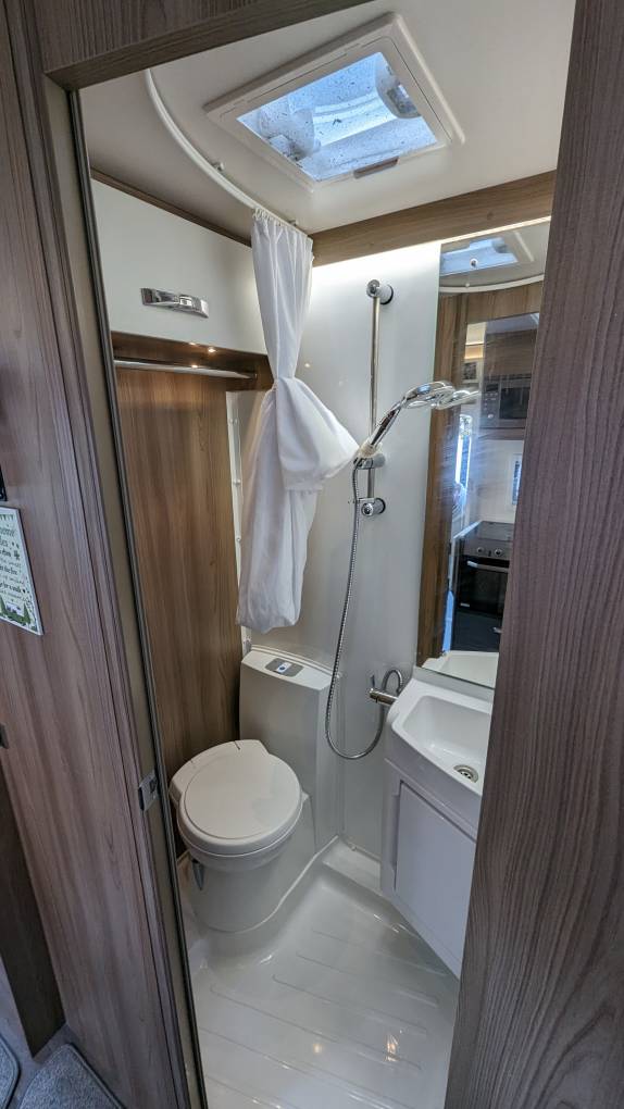 Step into the washroom and discover the comfort and convenience. Featuring a cassette toilet, sink with mixer tap and above storage cabinet, extendable shower, large mirror, and mood lighting, every detail is designed to enhance your experience on the road.