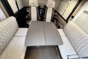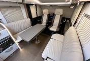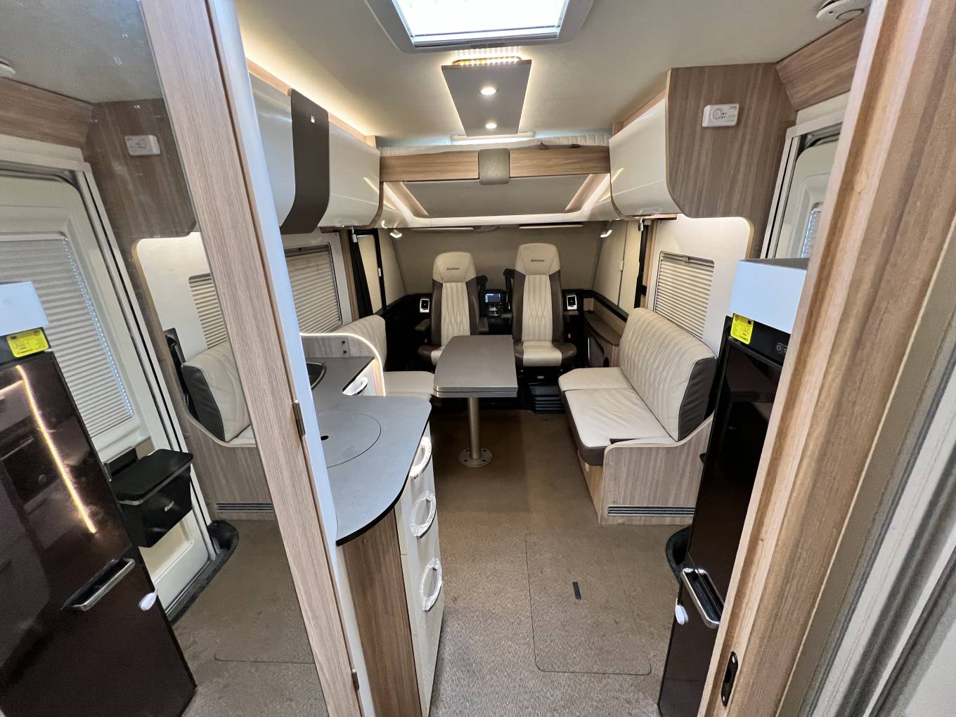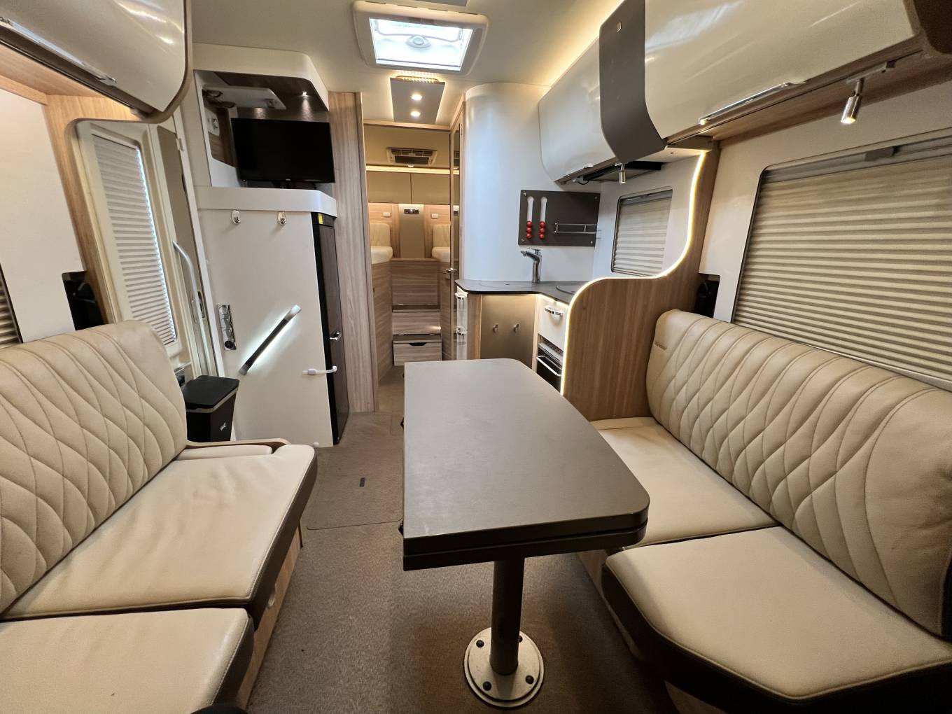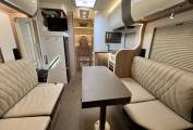 On entering via the habitation door up the electric step, to your right is the Lounge consisting of Two Inward Facing Settees, Twin Swivelling Cab Captains Chairs and a a pedestal mounted Dining Table that folds in half and slides in multiple directions for your convenience.