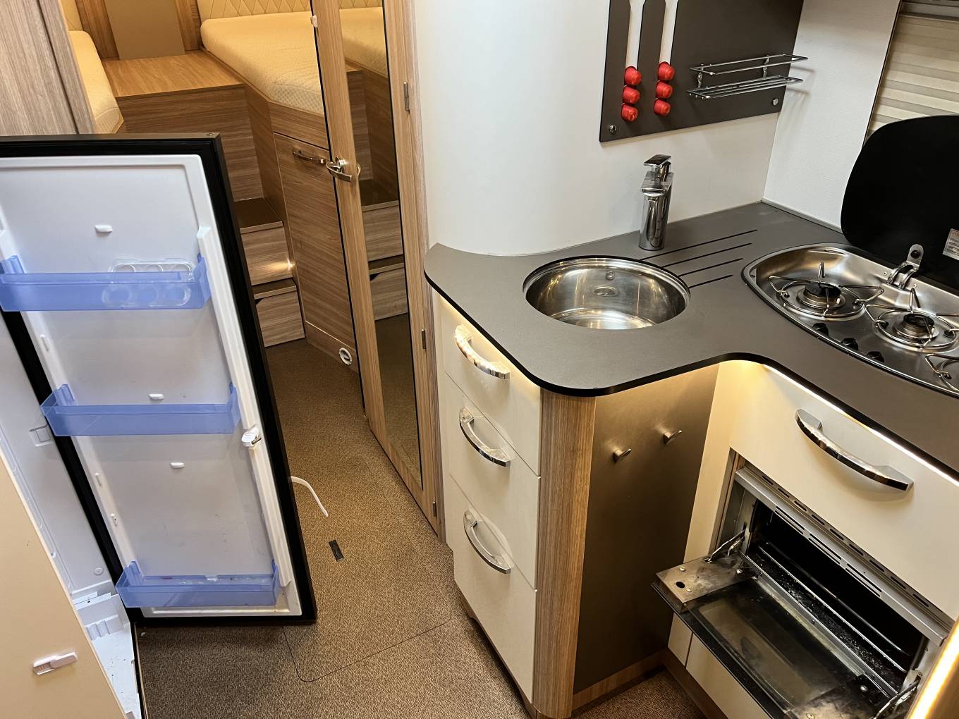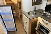 Across the centre of the motorhome is the well equipped kitchen where you will find a Three Gas Burner Hob, an Oven Grill combination, a Sink with a Hot and Cold Mixer Tap and a full sized three energy source Automatic Dometic Fridge Freezer.