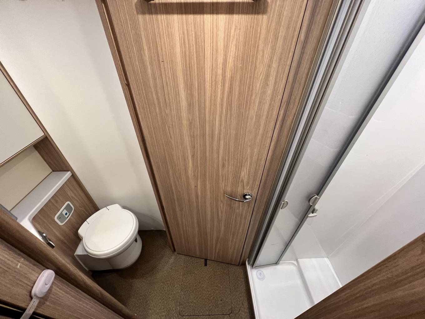 On one side is a Thetford Flush Cassette Toilet, a Wash Handbasin and cupboards, on the other is the Shower Cubicle.