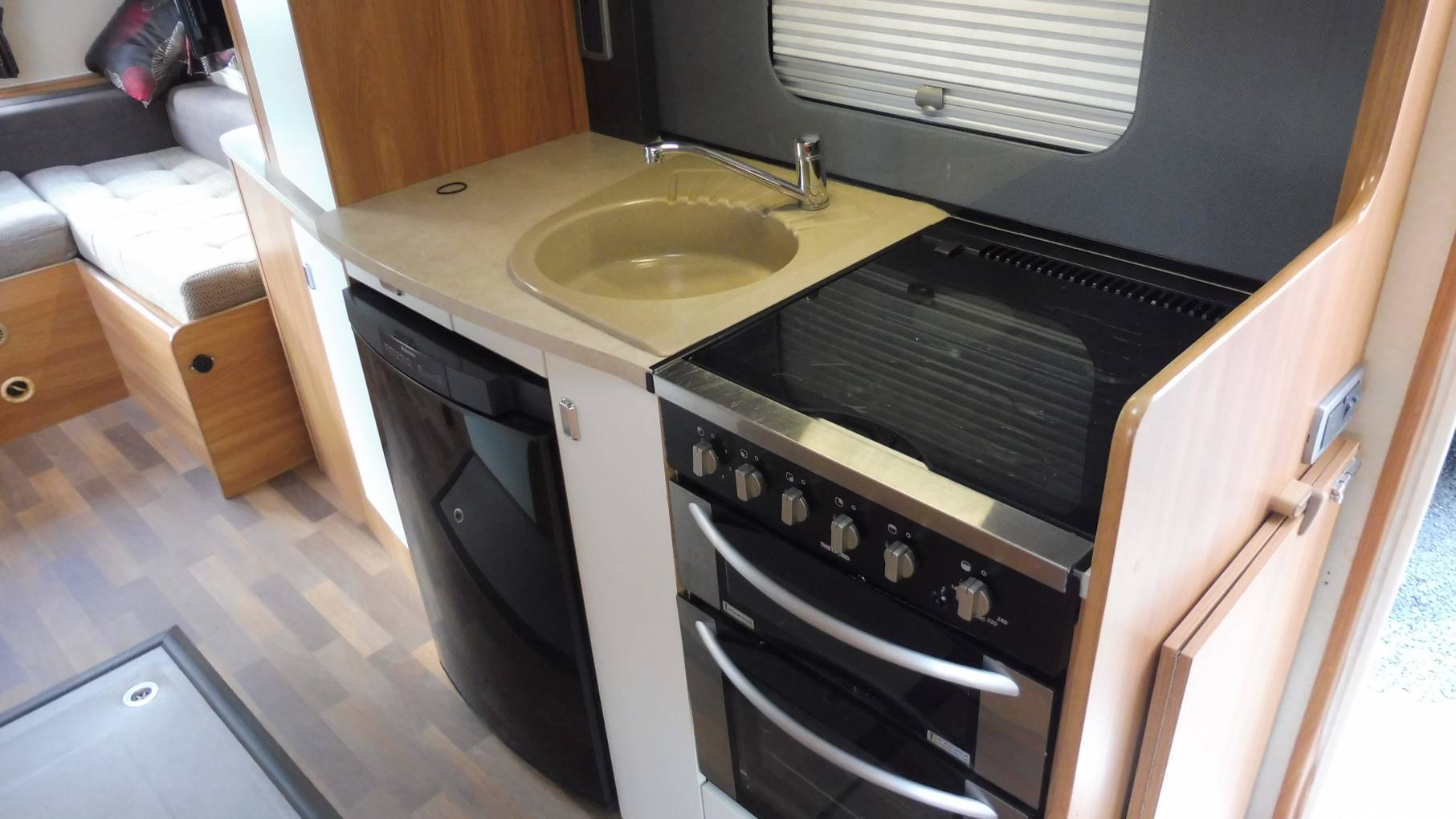The mid-ships kitchen is equipped with dual-fuel hob, full oven and grill, microwave and 3-way fridge – everything you might need to rustle up a lunchtime snack or full evening meal.