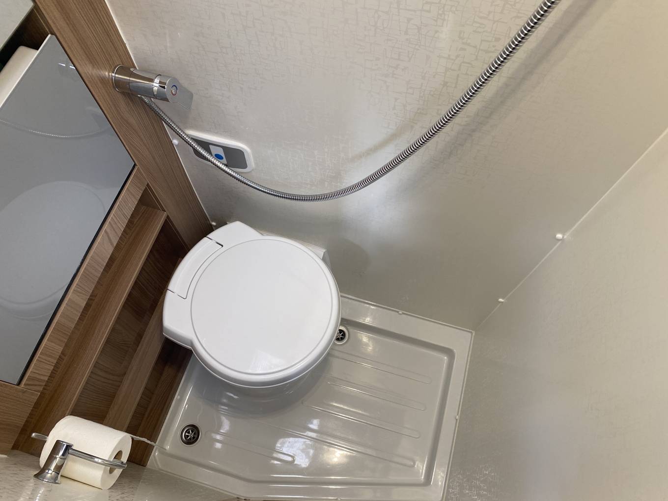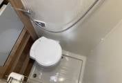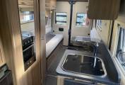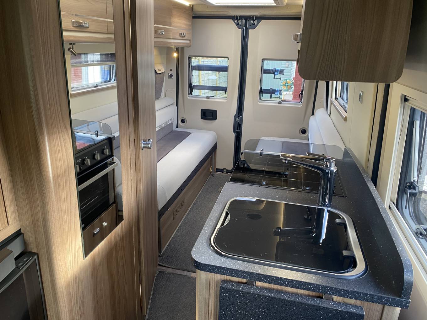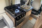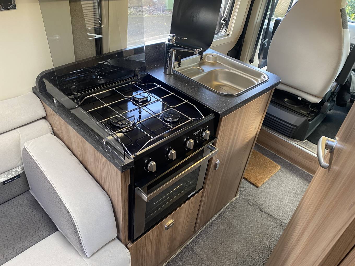 As we move through the motorhome, you have the popular washroom which consists of a shower Thetford toilet, opposite the washroom is the kitchen area which has everything you need to rustle up a lovely meal. There is a 3 gas ring burner hob, a Thetford oven with grill, a Dometic fridge with freezer compartment, a sink with mixer tap and lots of storage space for utensils and ingredients plus a good work top area.