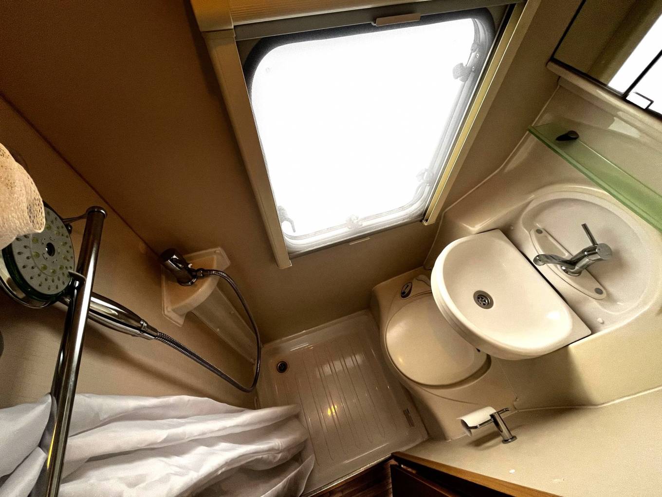 Next up you have the washroom this houses a cassette toilet with an electric flush, foldaway handwash basin and shower.