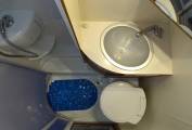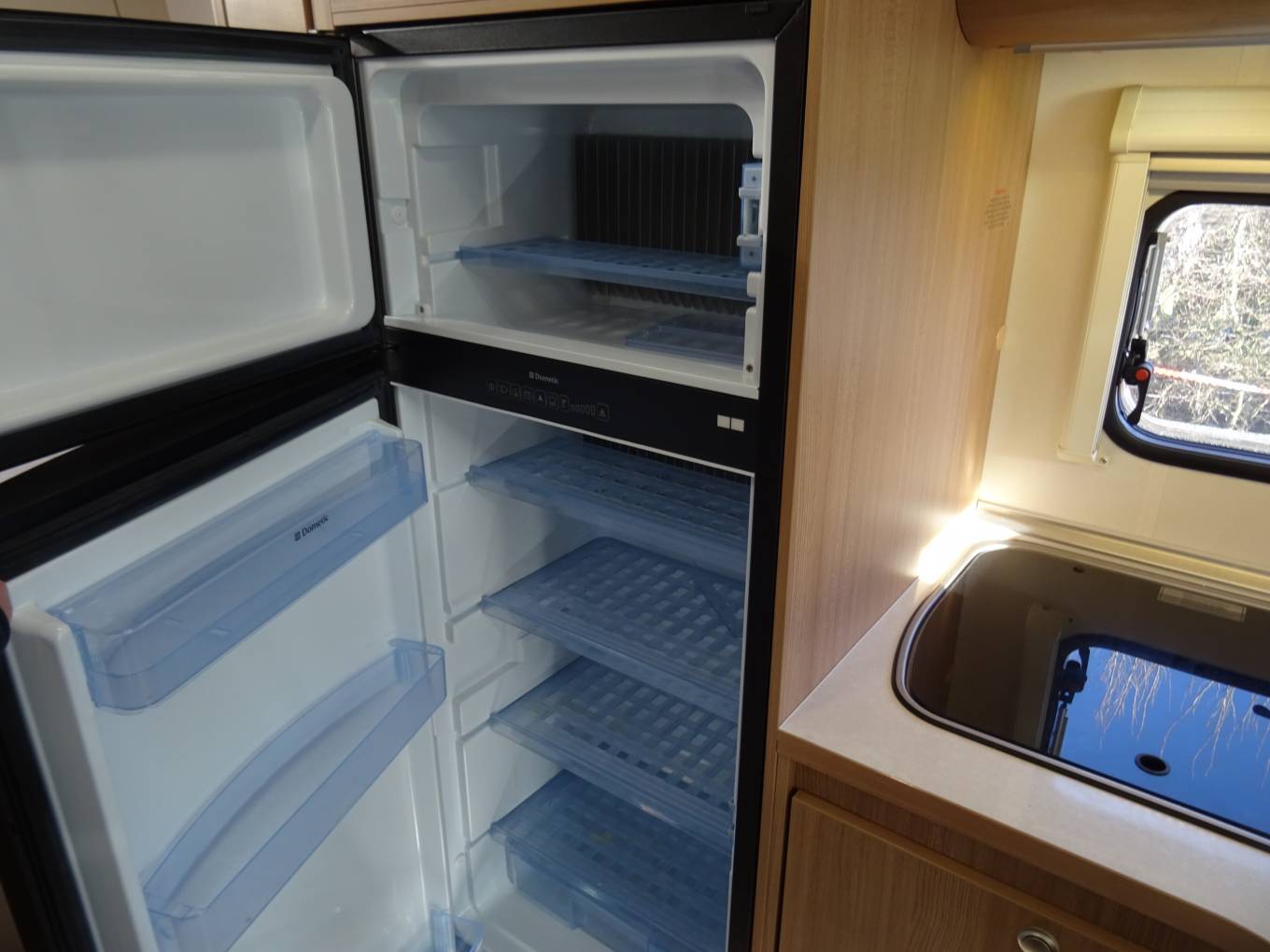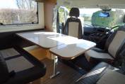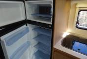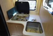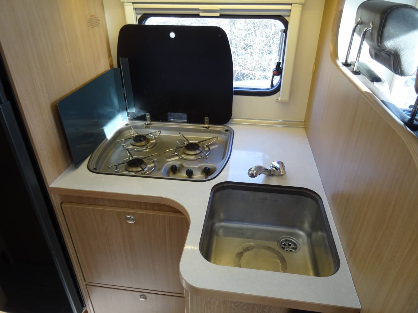 The spacious front lounge area is made with a forward facing double seat with 2 seatbelts, the two front captains seats which can be swivelled, and a side facing settee behind the drivers seat. There is a table which can easily be extended and is a great area to dine and relax in . This area can be made up into another double bed if required. There are skylights which allow plenty of light in and all the windows have blinds and fly screens.