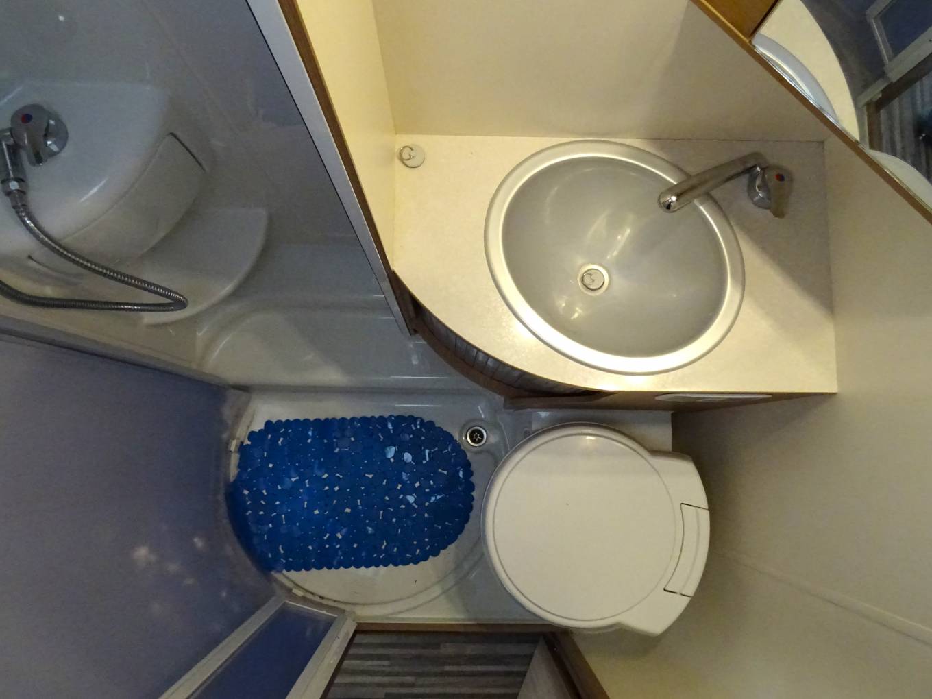 The habitation door is set on the offside. On entering there is a storage cupboard immediately to your left. Next comes a practical bathroom with a screen to separate the shower and then a large double bed at the rear over the garage. There are overhead lockers in this area. The steps up to the bed also act as storage boxes.