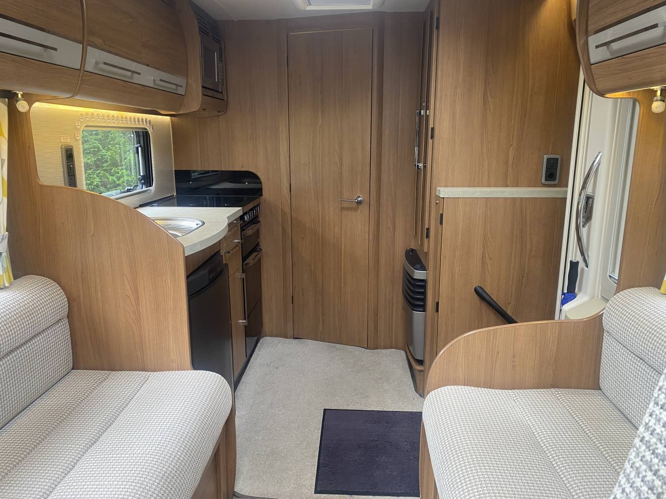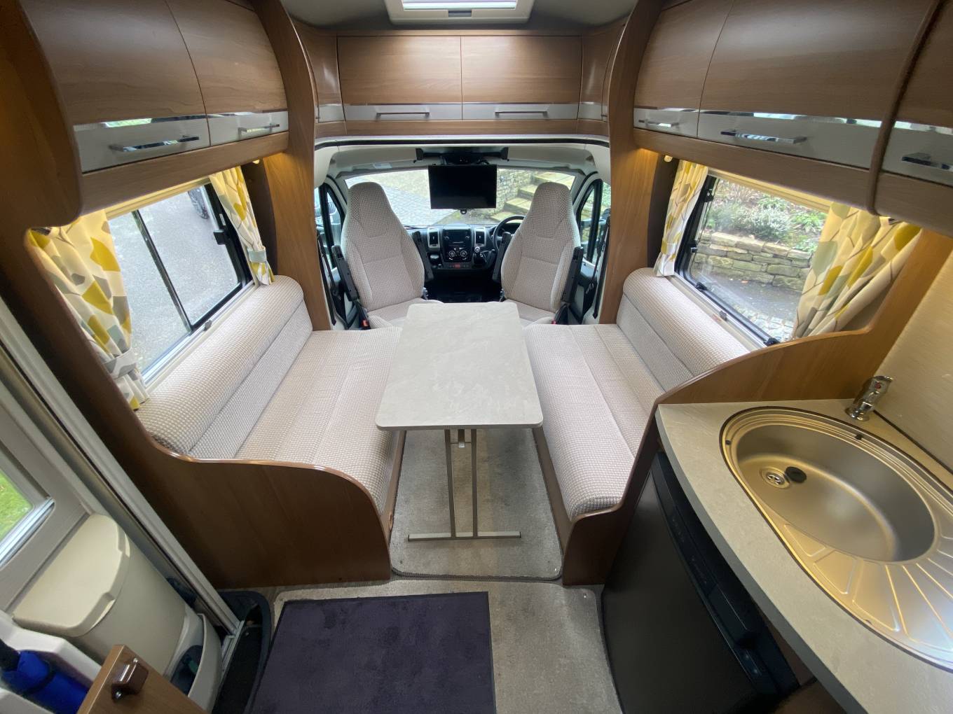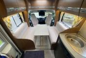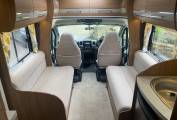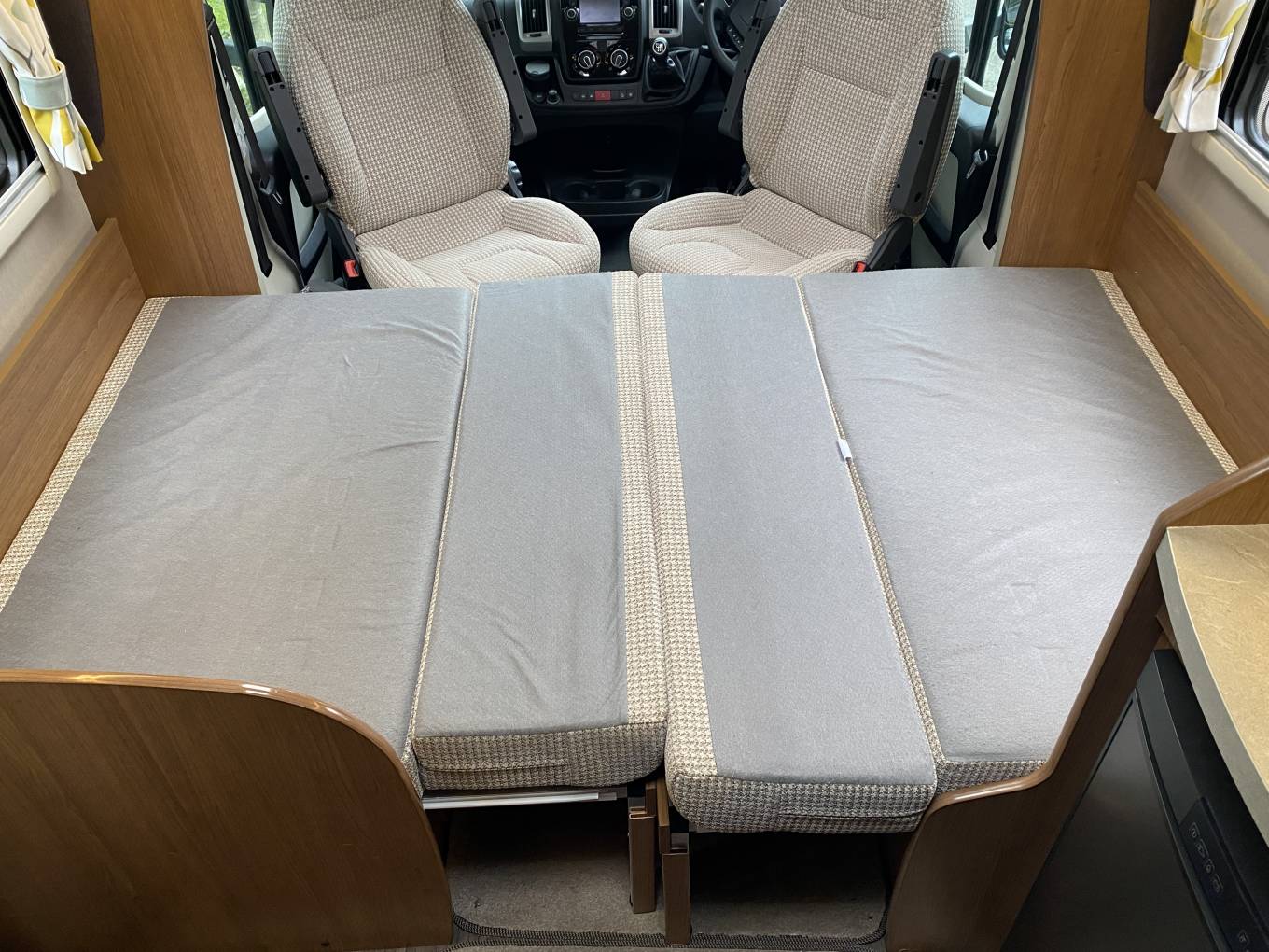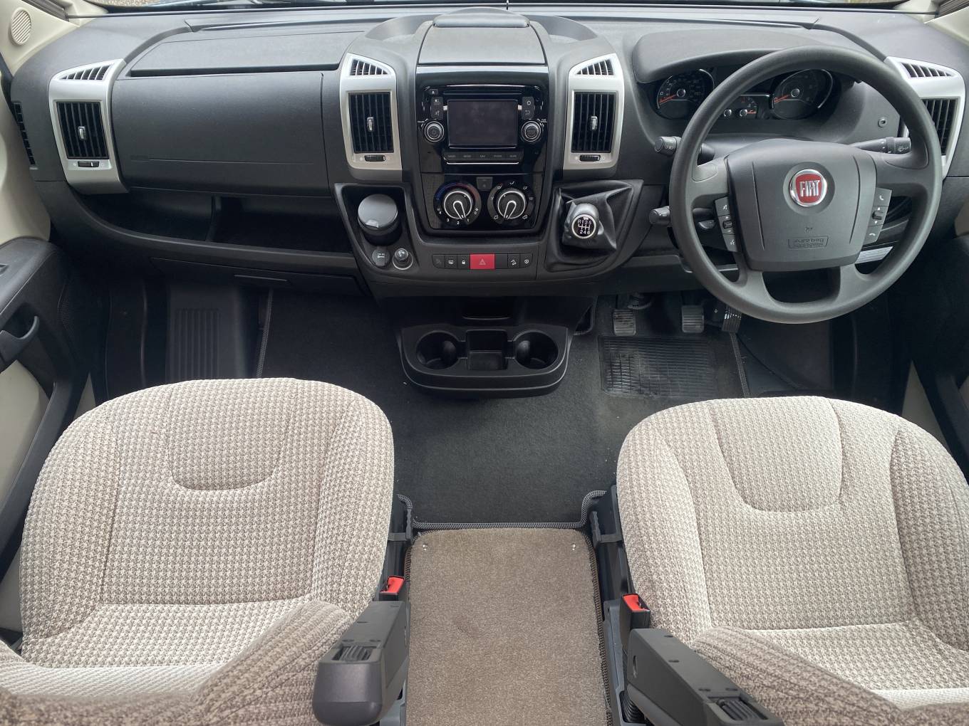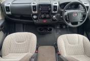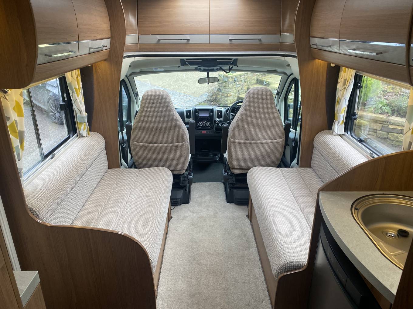 As we enter the front of the motorhome, there are 2 swivel seats that can face the central lounge area. In the cab there is air conditioning, radio and reversing camera. There are also electric windows and mirrors.