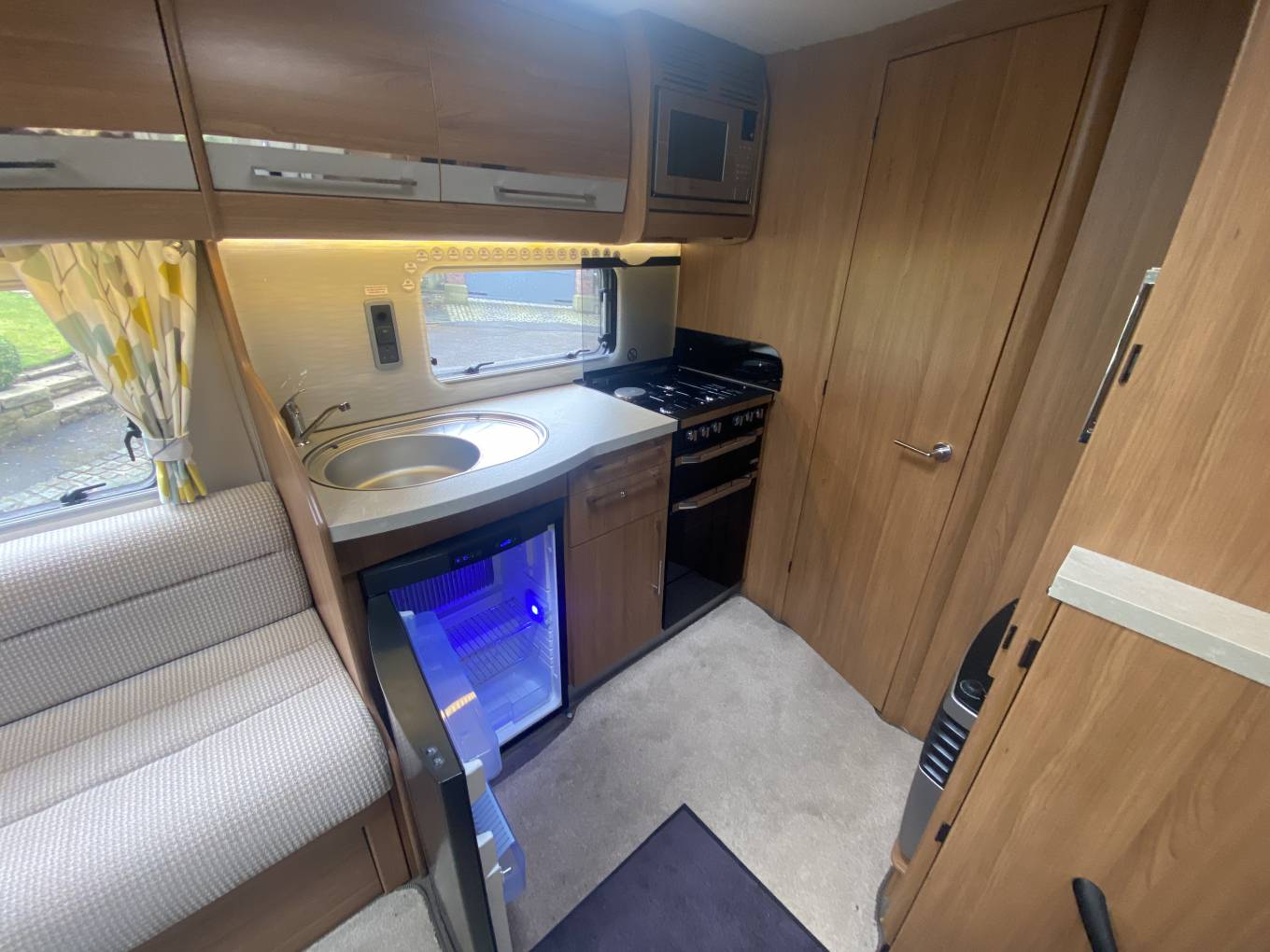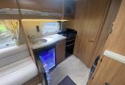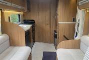 Carrying through to the centre of the motorhome, we have the kitchen area where there is a large Oven with a grille and 3 ring gas and 1 electric hob, sink with mixer tap and a Dometic fridge with freezer compartment, microwave and a very large work top area, perfect for preparing and plating up a nice meal.