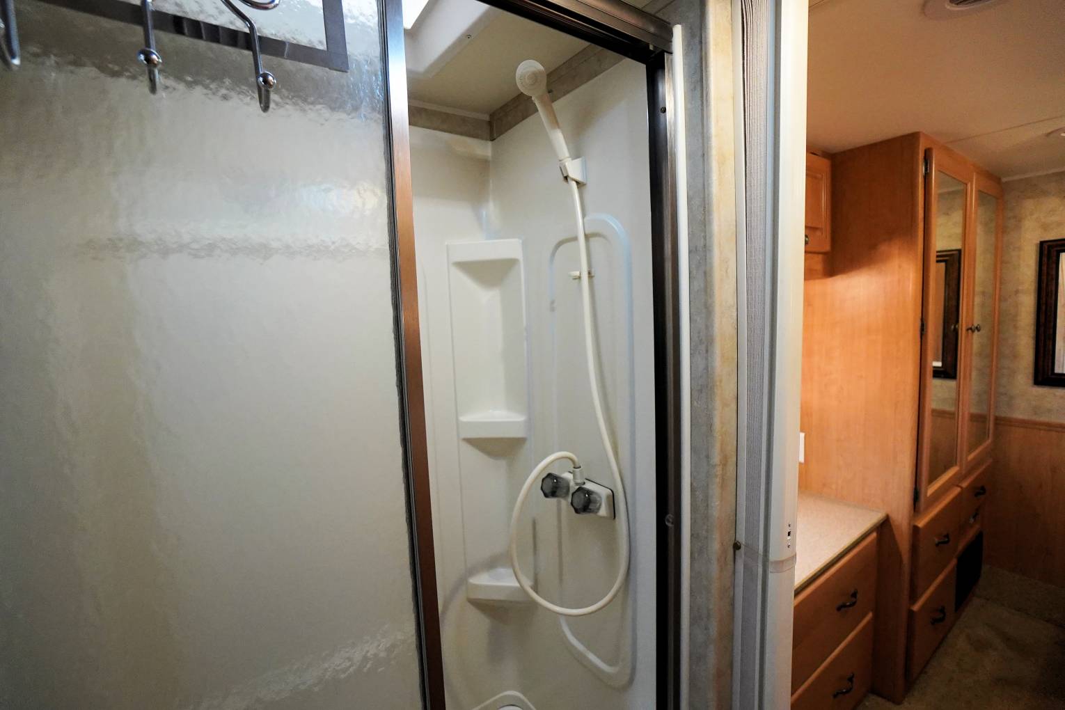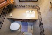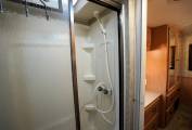 The large washroom has a full-size shower cubicle, toilet, wash hand basin, built in wardrobe and there are sliding privacy doors between the lounge area and bedroom