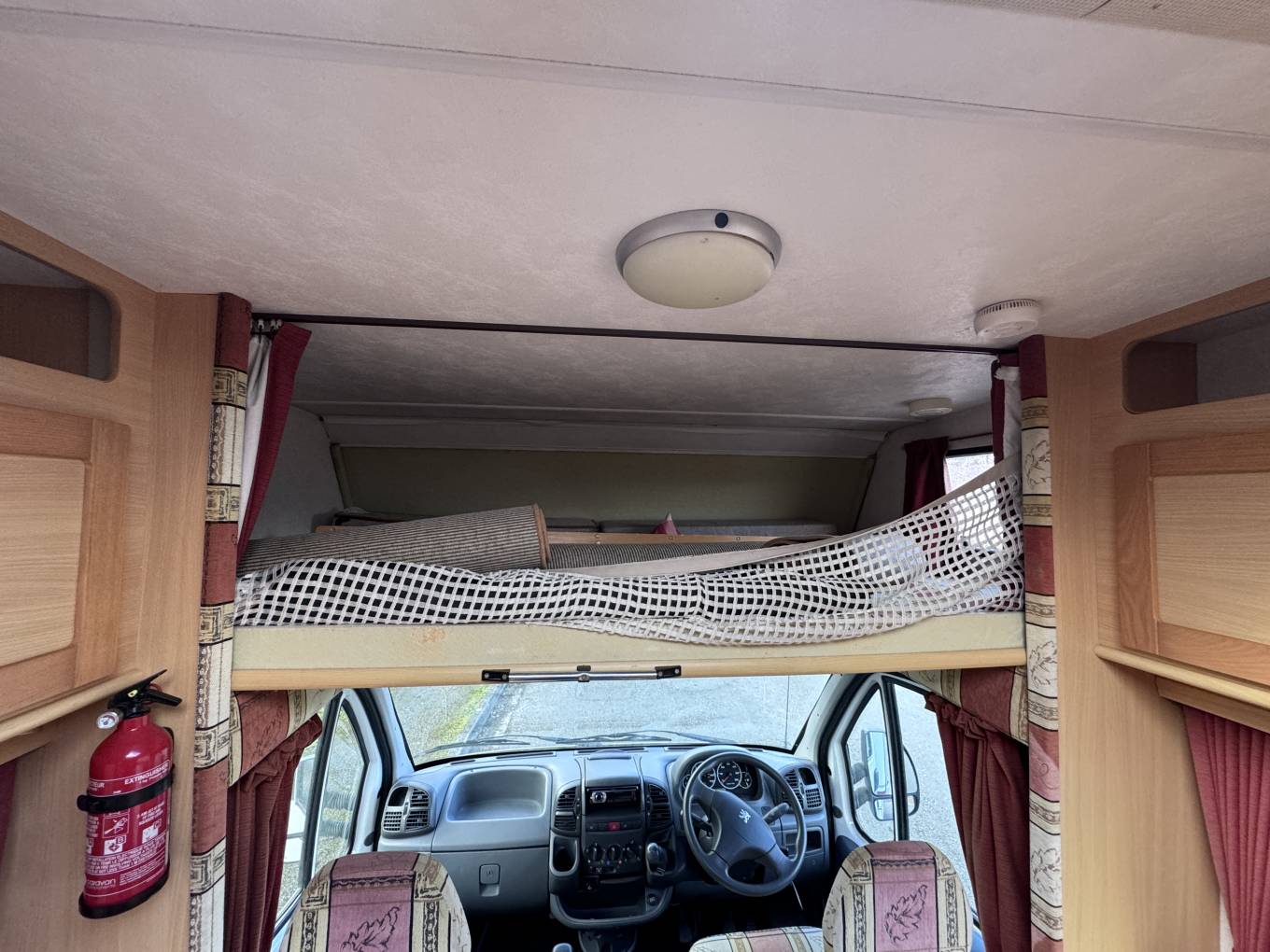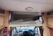 The over cab bed can be used as a single or will slide backwards to make up a double bed, accessed via a wooden step ladder, there is a window, lighting, privacy curtains plus a child safety net.
