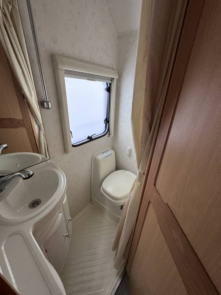 The washroom has a good sized shower tray with a domestic style shower head fitted on a rising rail, a pull down wash-basin with mixer tap and a Thetford cassette swivelling toilet with pull handle flush.