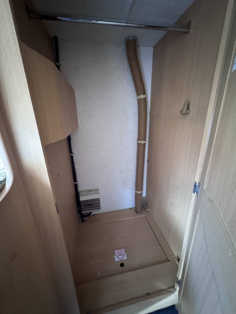 A good sized wardrobe with hanging rail and a second folding dining table stored within, plenty of upper aircraft style lockers and under seat storage available.