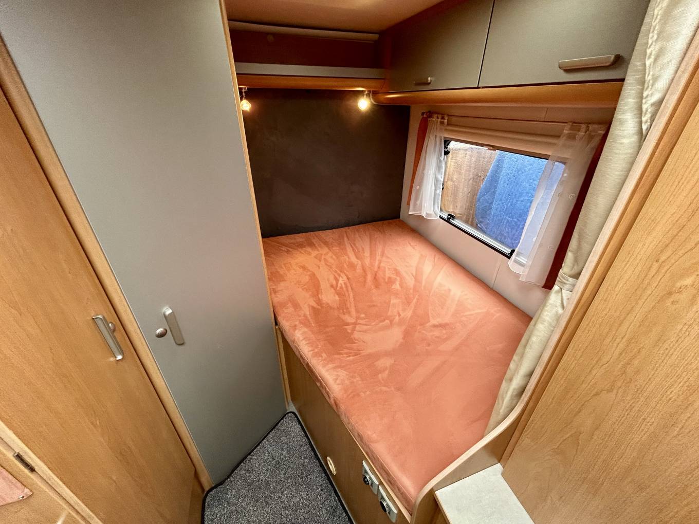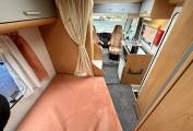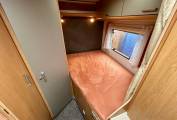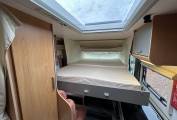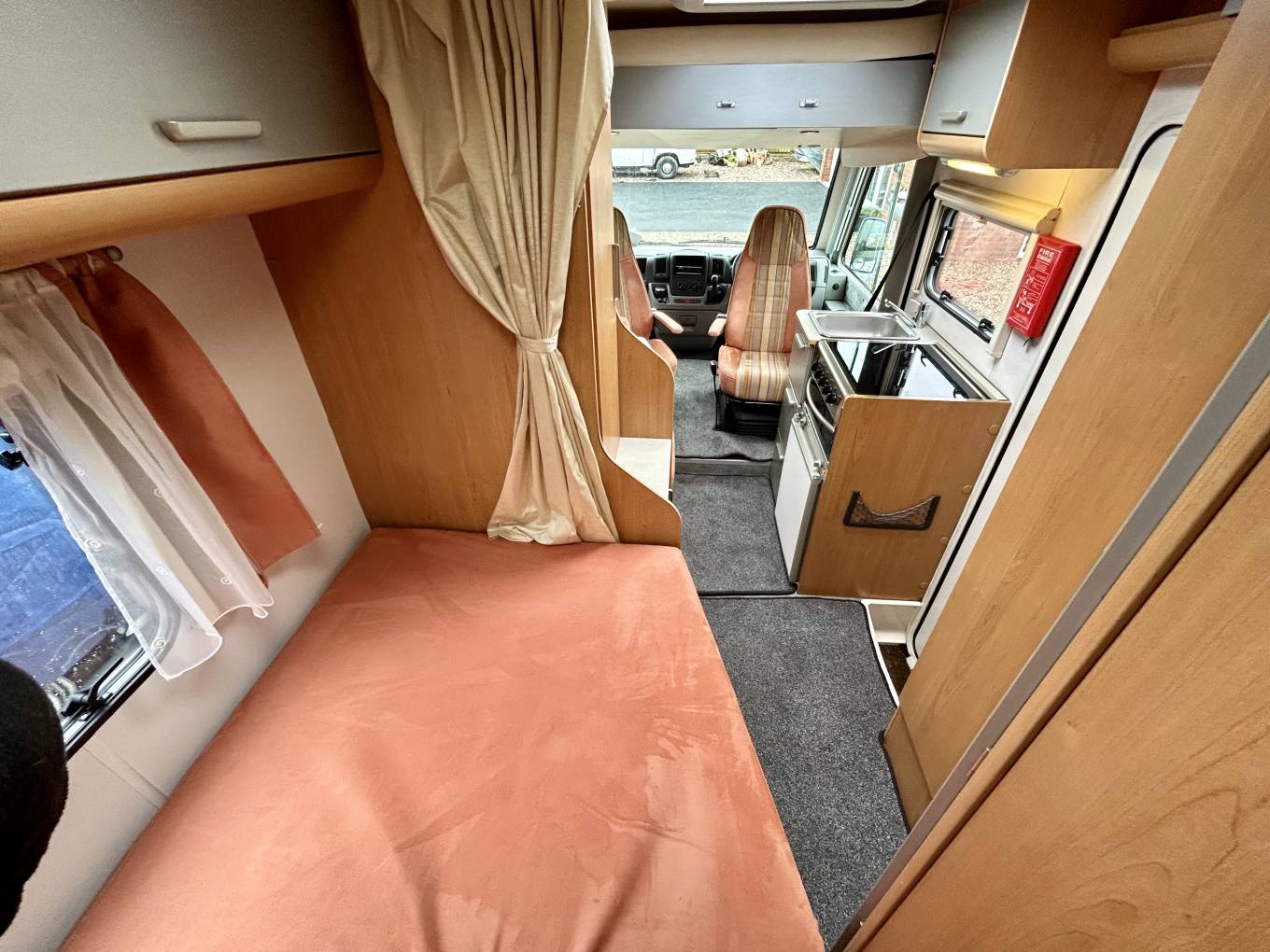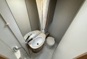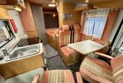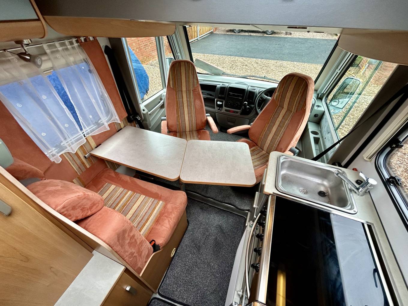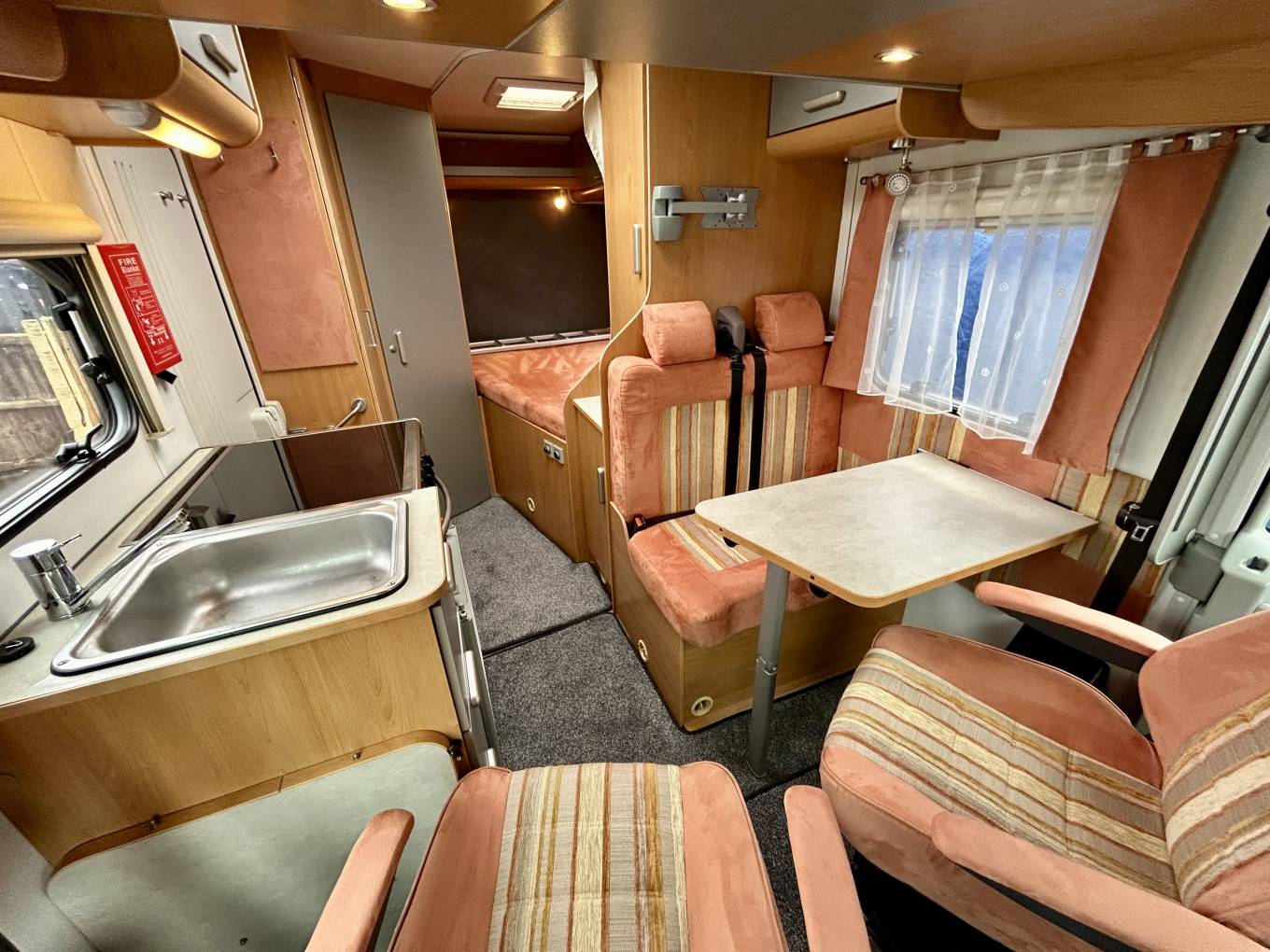 At the front of the vehicle is a good sized drop down bed which can be used for two children or extended to create a huge double which will easily sleep two adults under this is a bright and spacious cab area that features two swivel seats that turn to create part of the dining area, this comfortably seats four with the bench seat which is home to two additional travel seats. Opposite the bench is the kitchen area featuring a sink, hob and grill and good sized fridge with ice box. Moving towards the rear of the vehicle is a fixed bed with an abundance of storage underneath, n the opposite rear corner is the washroom complete with cassette toilet, hand basin and shower.