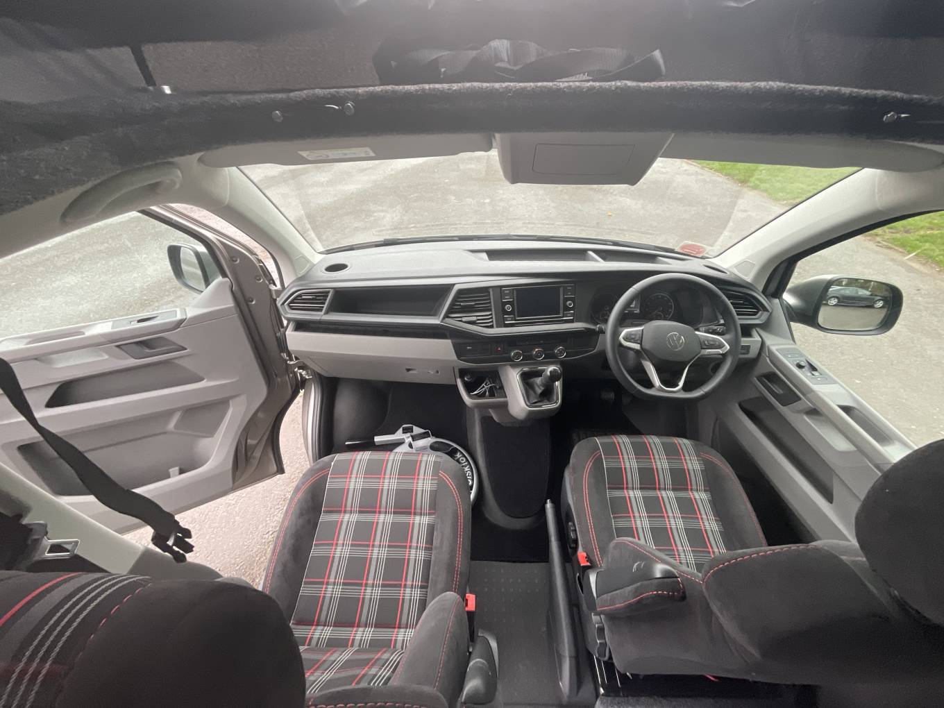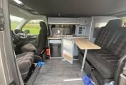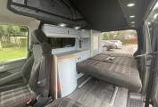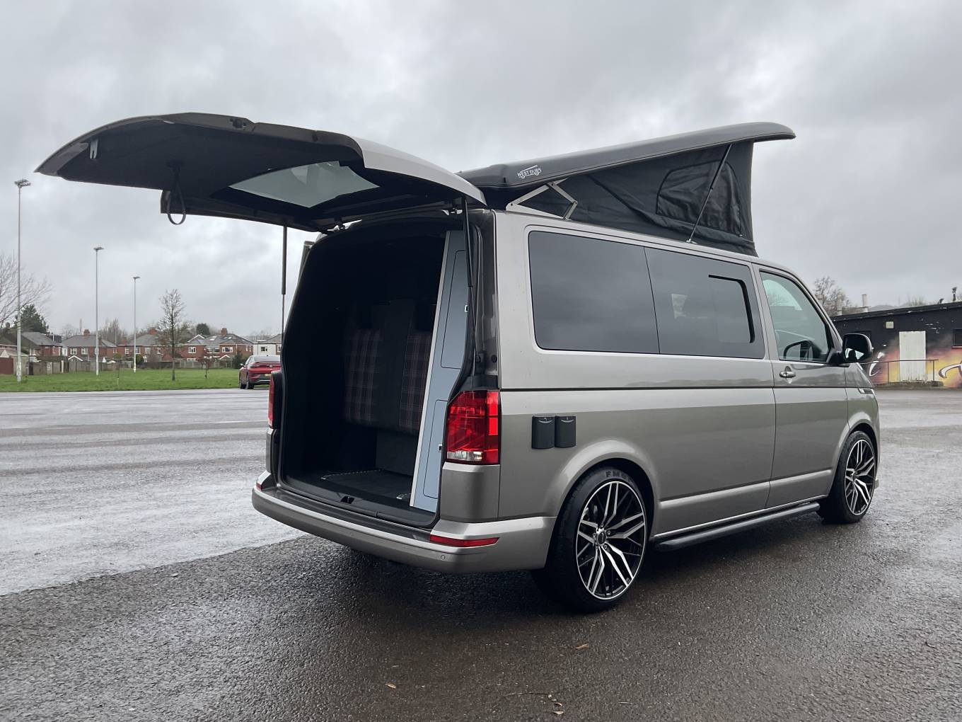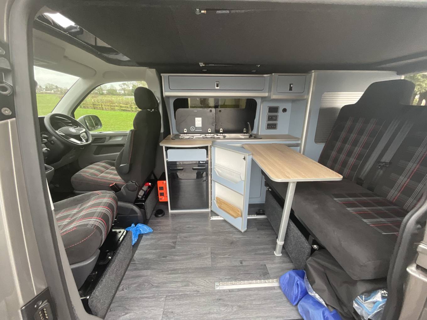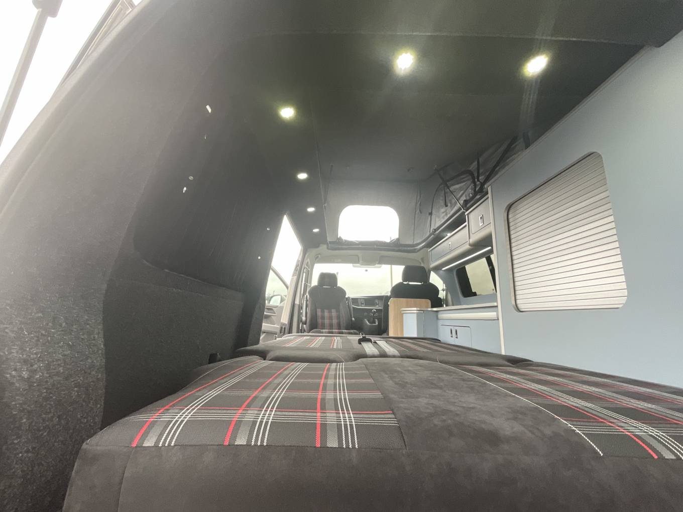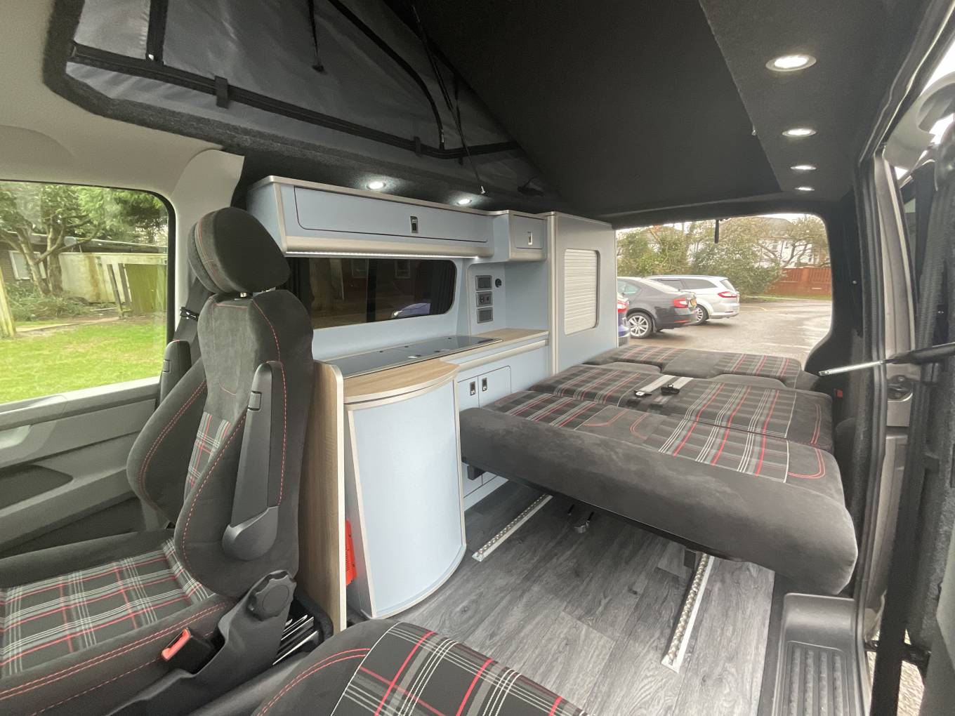 This camper is in immaculate condition and is a real head turner in Mojave Beige finish. The diamond cut alloys, side bars and lowered suspension make it stand out. It has a Skyline slim pop top roof with a panoramic canvas that opens up fully. Inside the upholstery is finished in a Recaro GTI red and grey trim, the worktops are a light beech finish and the cabinets are flush fitted pale blue.
