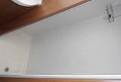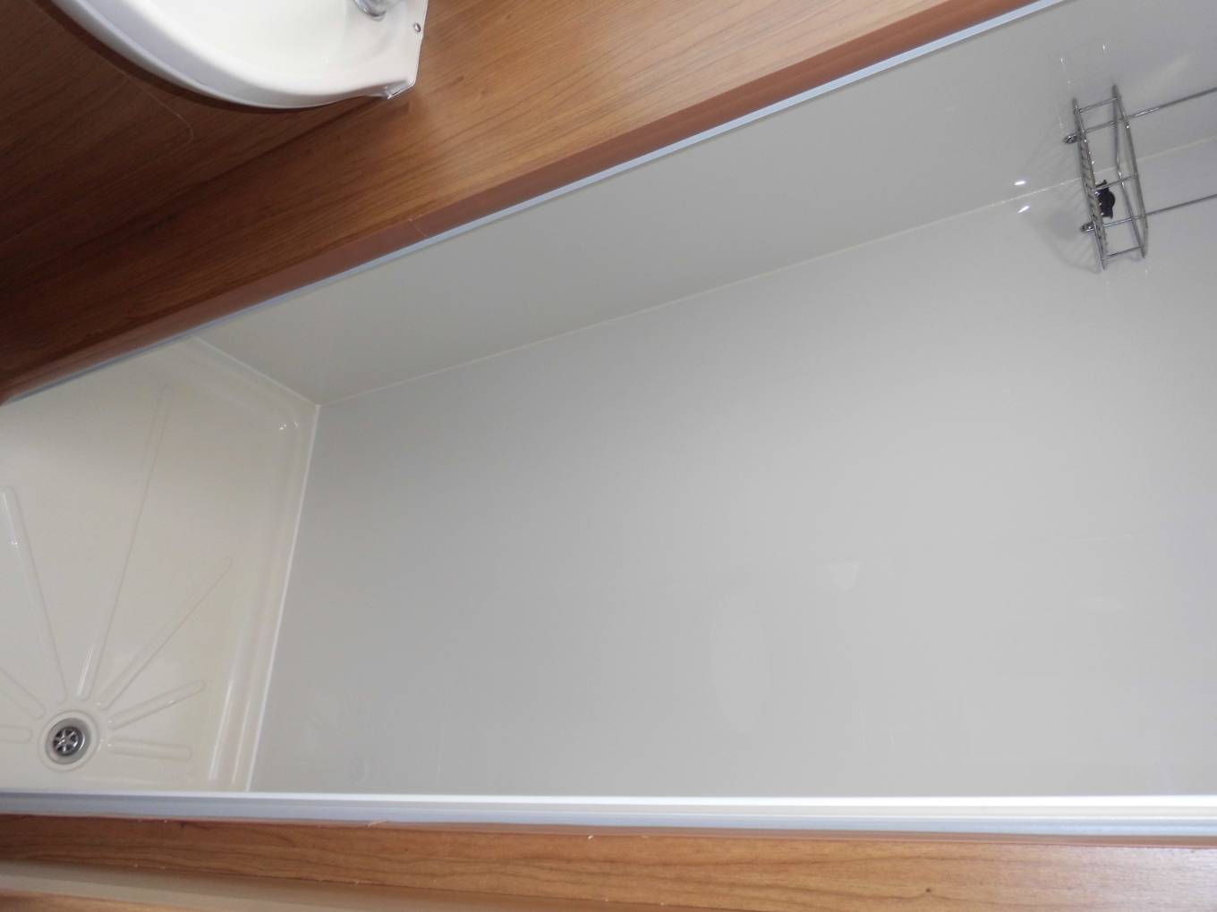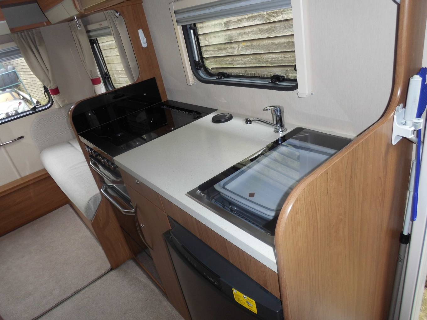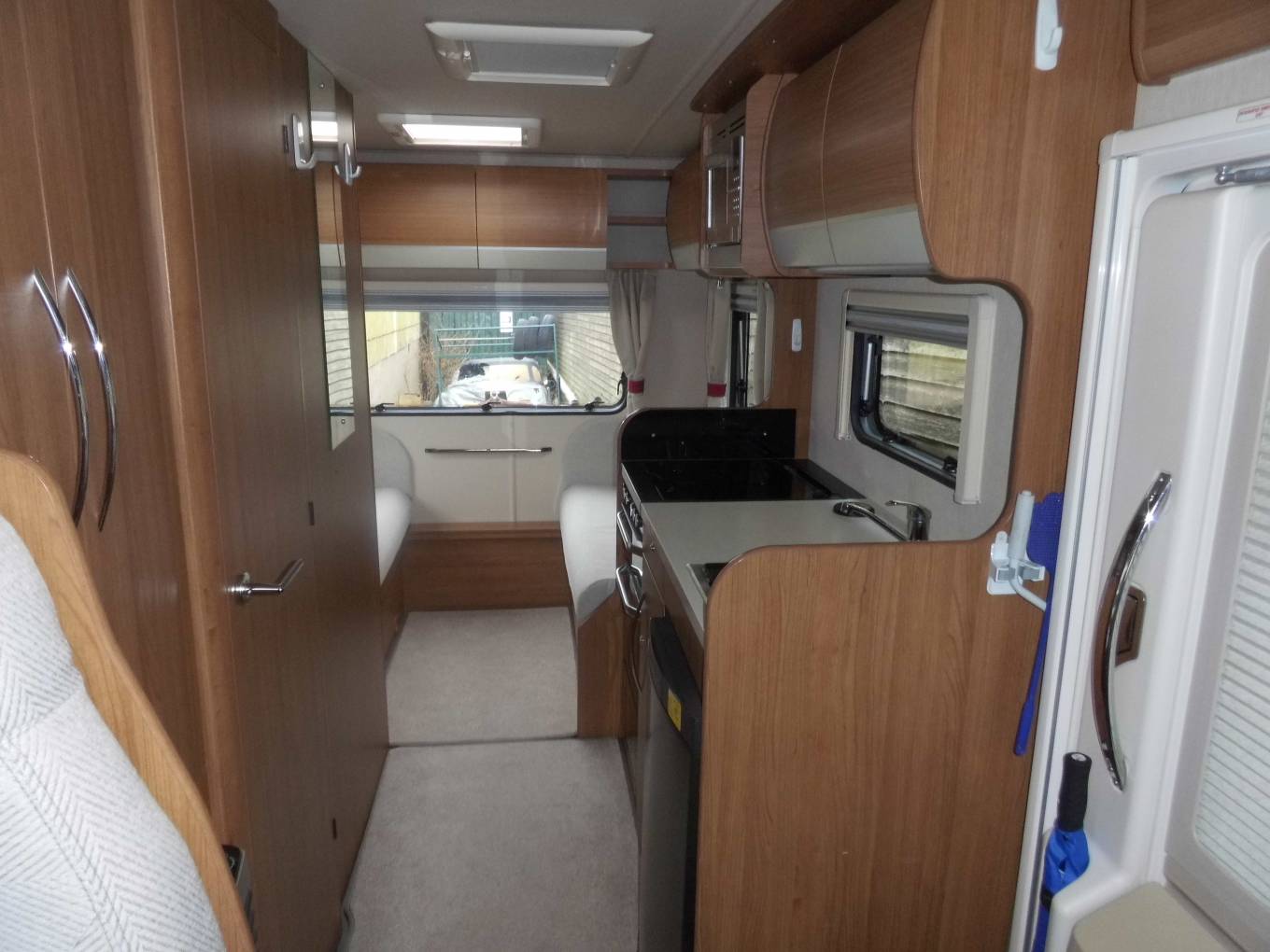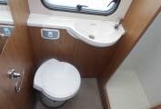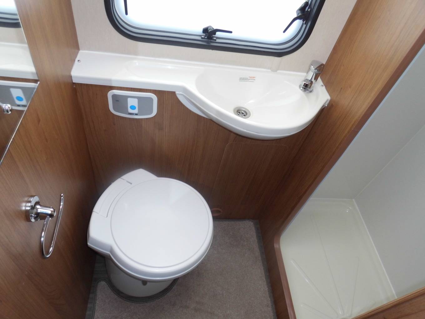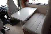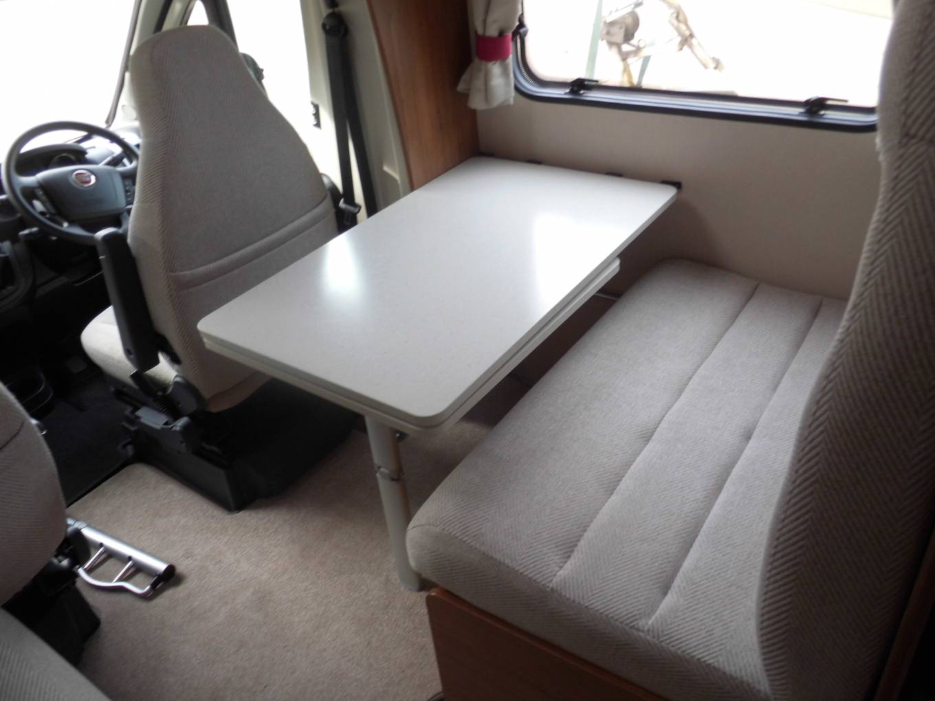 The kitchen; which is on the nearside; is fully equipped with a separate full sized oven and grill, hob with one electric & three gas rings, stainless steel sink with glass lid, built in microwave oven, and a three way fridge with freezer compartment, along with ample storage and lighting within the Kitchen area. Opposite the kitchen you will find the washroom which offers you a separate shower cubicle, vanity hand washbasin and a Thetford cassette toilet with electric flush. A large opaque window and rooflight gives this area a light and spacious feeling. At the front of the motorhome you will find the dining area which, with the two forward facing seats, side bench and two Captain seats as well as drop down TV provides the perfect area to relax. (The two forward facing seats have 3-point travelling seat belts so any family and friends can travel in safety).