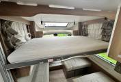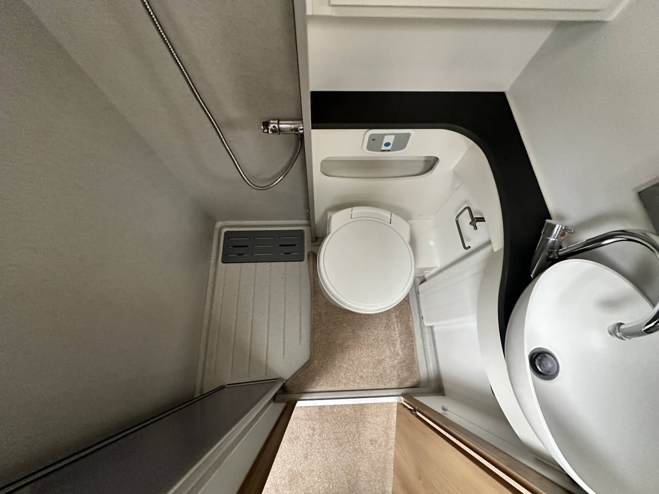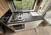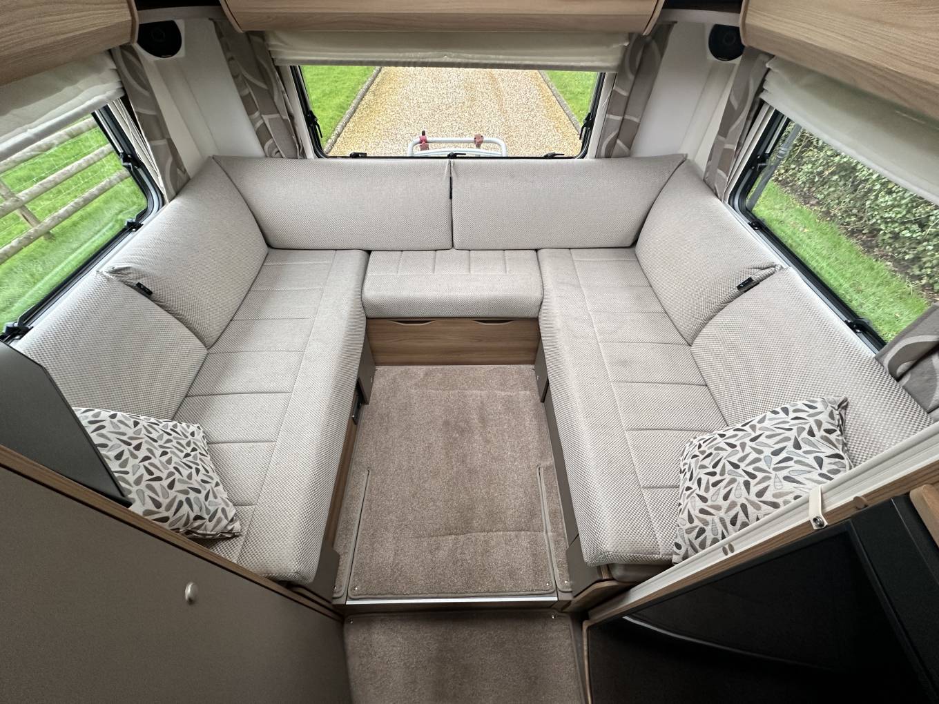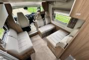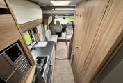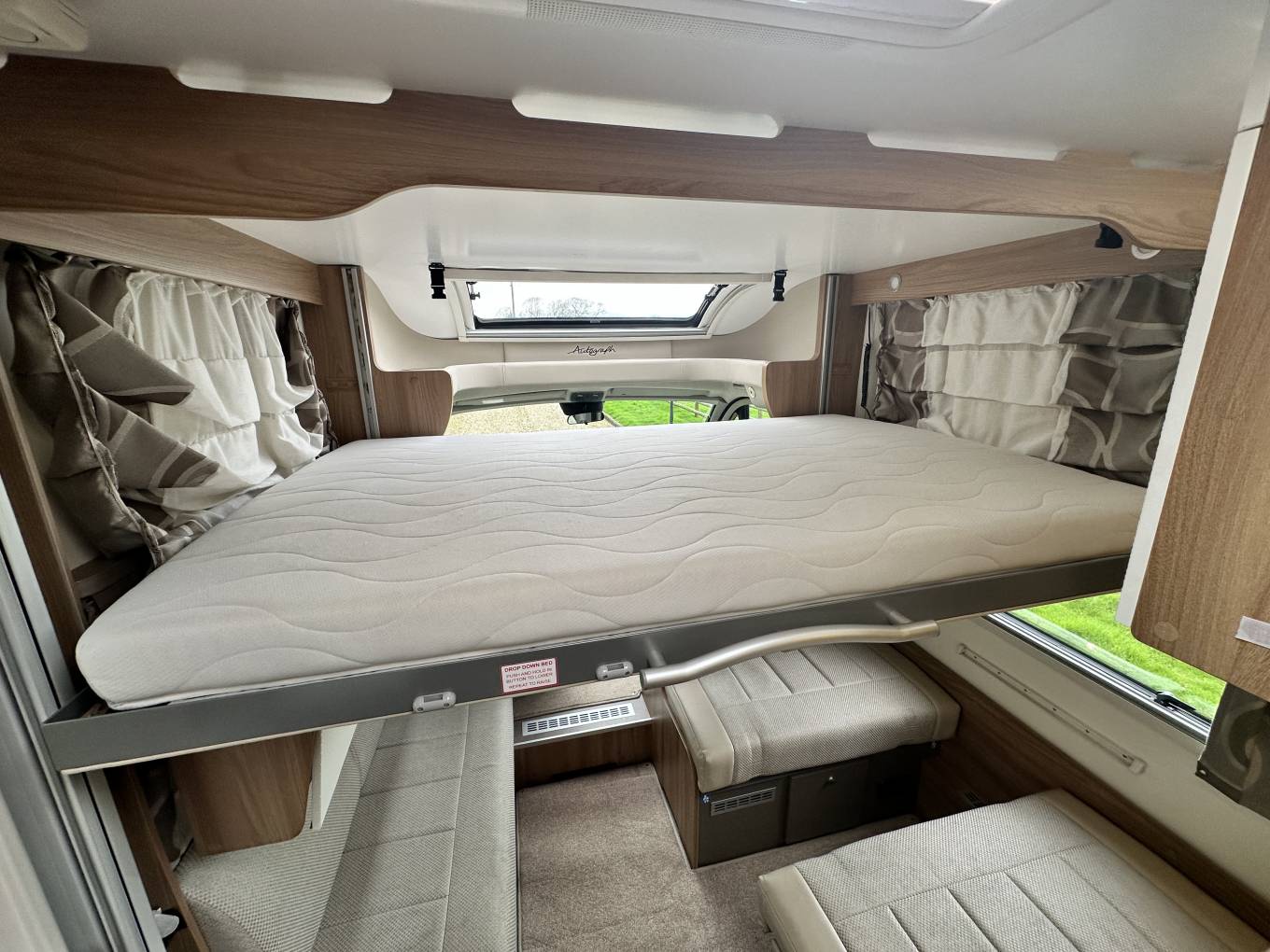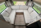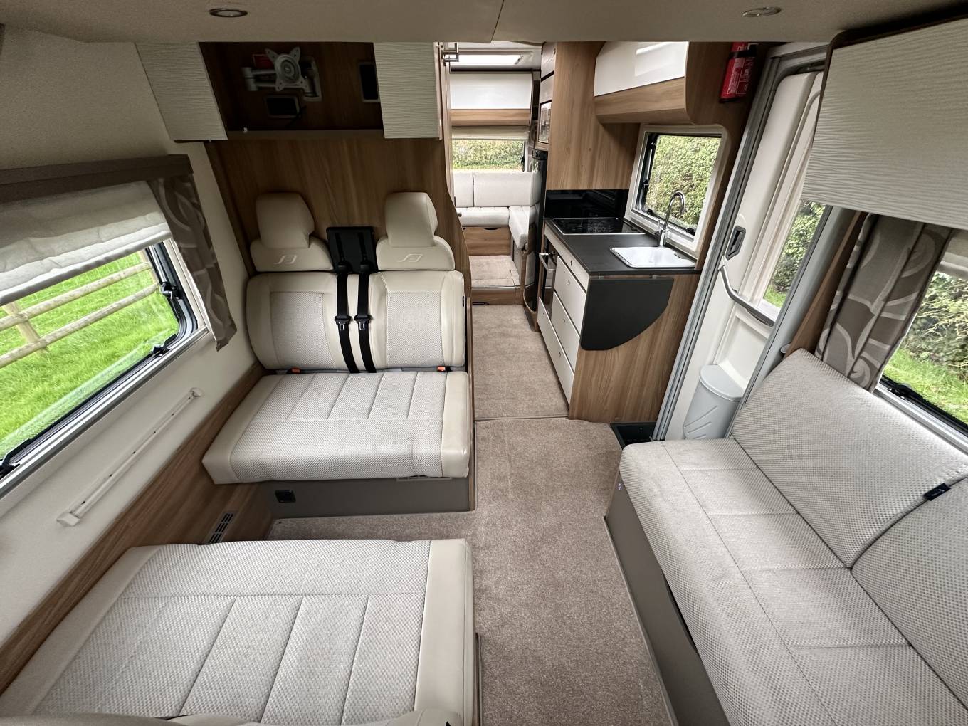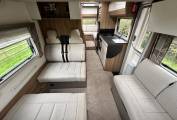 Firstly, we start at the rear with a huge lounge. This is the perfect place to relax and take in the surrounding views. When the night draws in the rear lounge converts to a comfortable double bed. Next we have the washroom. This features a toilet, shower and wash basin. To the front is a well equipped kitchen. This includes a gas hob, electric hot plate, large 3 way fridge freezer, oven, microwave, grill and wash basin. Opposite is the dinette area complete with six 3 point seat belts and this also converts to a double bed. Above is a huge comfortable pull down bed to complete the 6 berth.