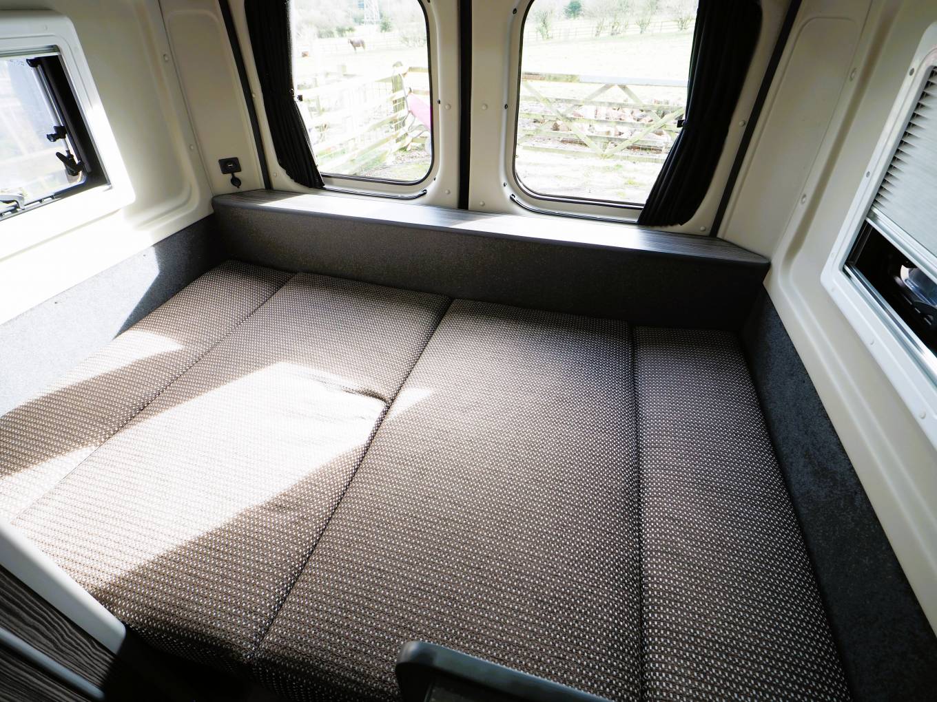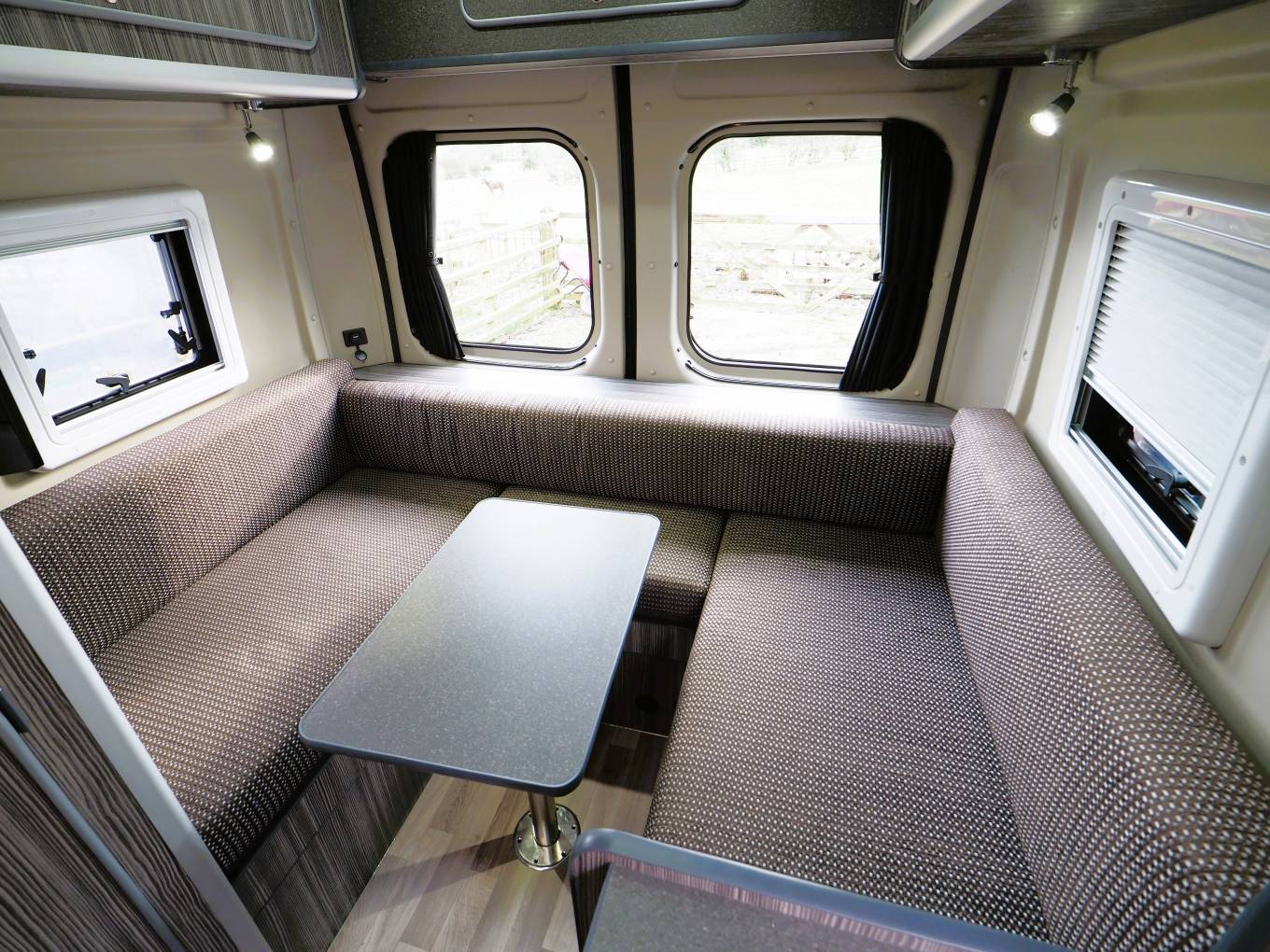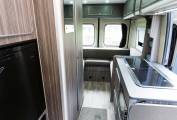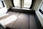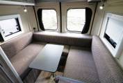 A rear u-shaped lounge provides a comfortable and spacious seating area with TV mounted to one side. There are 230V sockets and USB points to provide power for electronic devices. Storage under both side sofas and in the overhead lockers. A freestanding table can be set-up to provide an area to dine, entertain or even work. The lounge swiftly converts to a good sized double bed providing 2 berth accomodation.